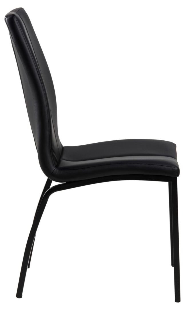 Deze eetkamerstoel brengt comfort en eenvoud naar je eethoek. Zwarte PU-bekleding met ritssluiting en hoge rug. Matzwarte, gepoedercoate stalen poten met kunststof doppen die je vloer beschermen. Zitbreedte 38 cm, diepte 40 cm, zithoogte 44 cm. Deels gemonteerd. Draagkracht 110 kg.