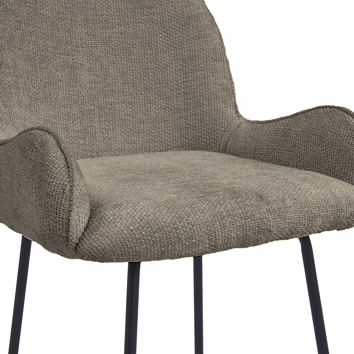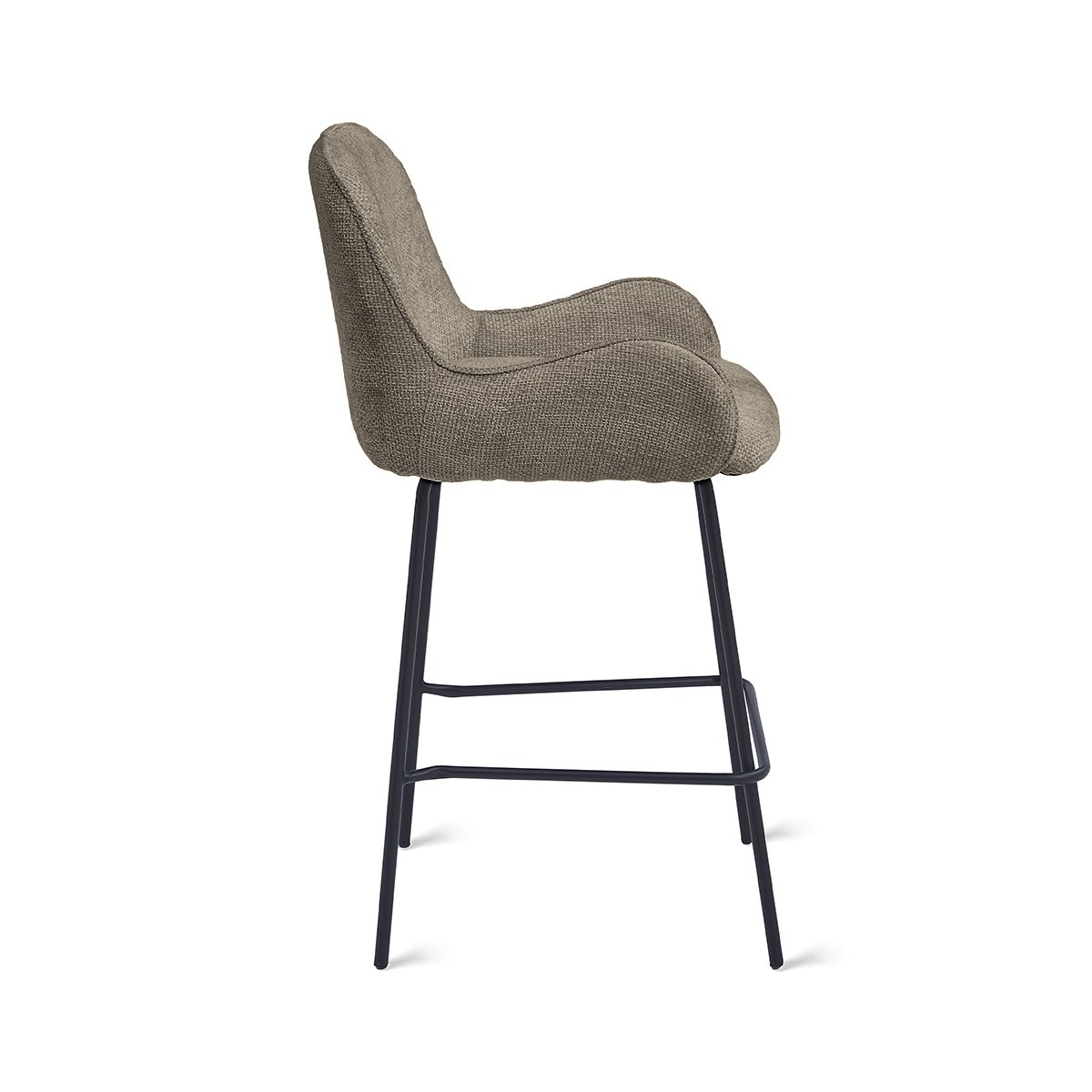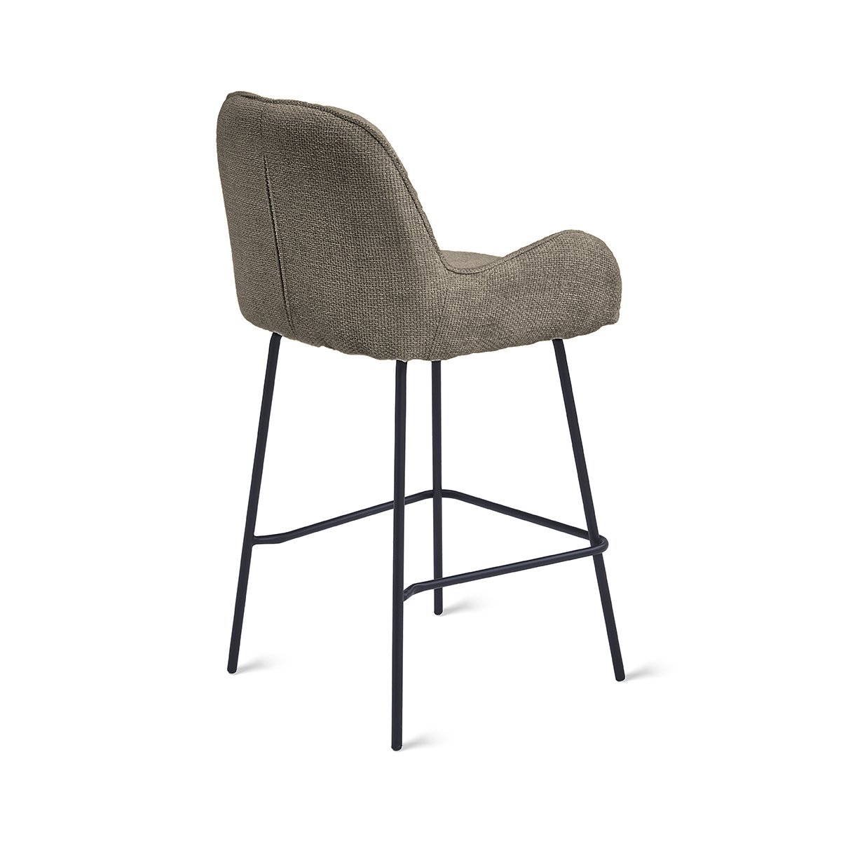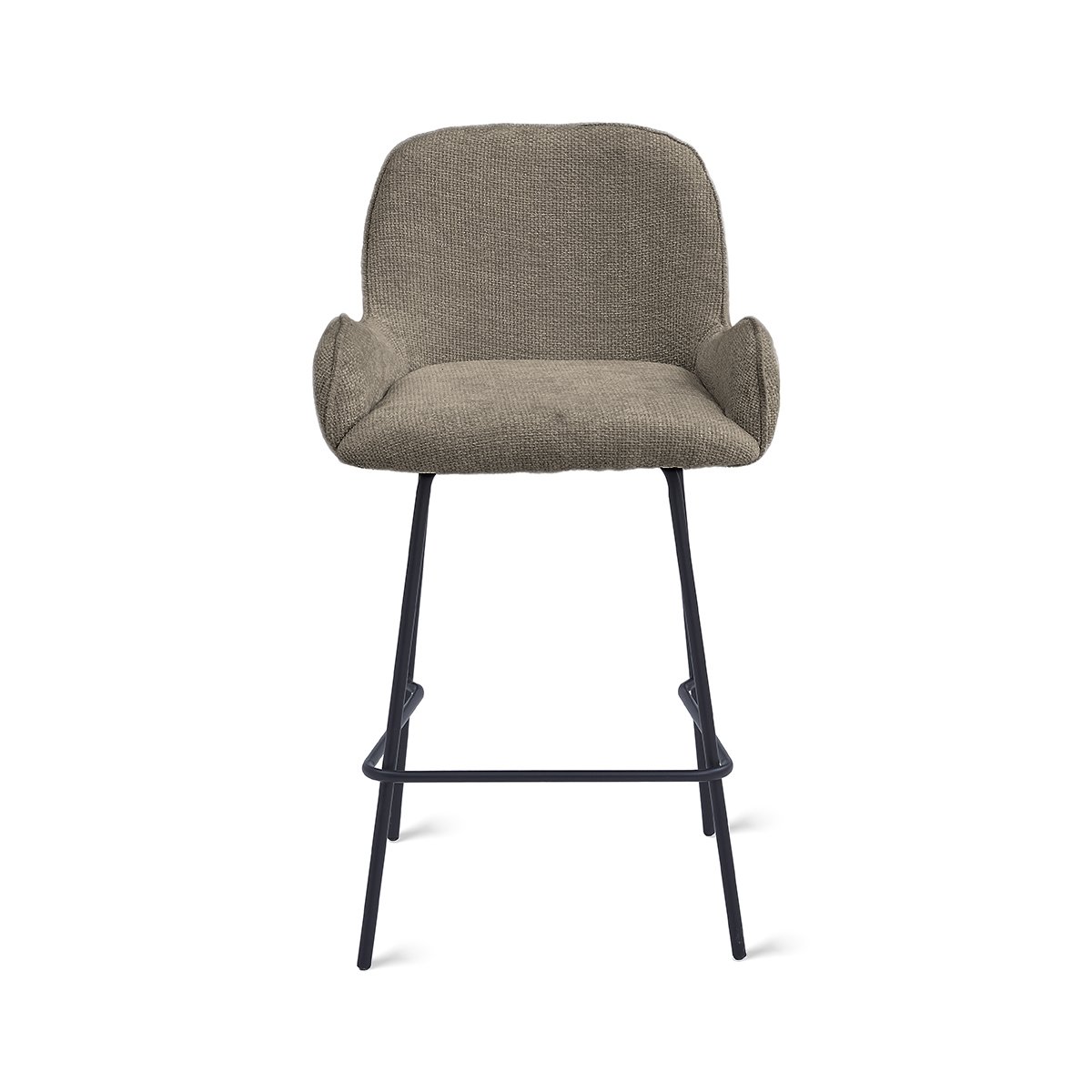 Comfortabele barkruk met zachte taupekleurige bekleding; minder geschikt voor wie extra rugondersteuning zoekt. Prima voor moderne interieurs.