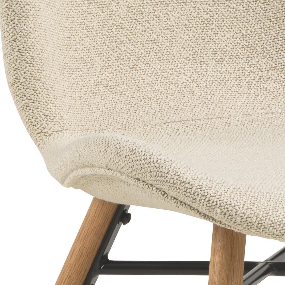 Deze eetkamerstoel combineert zachte crèmekleurige stof met geoliede eiken poten en kruisverbinding voor stabiele, warme uitstraling. Slijtvast (Martindale >45.000), brandwerend en met viltjes voor vloerbescherming. Demontabel. Comfortabele zitting, max. draagkracht 110 kg.
