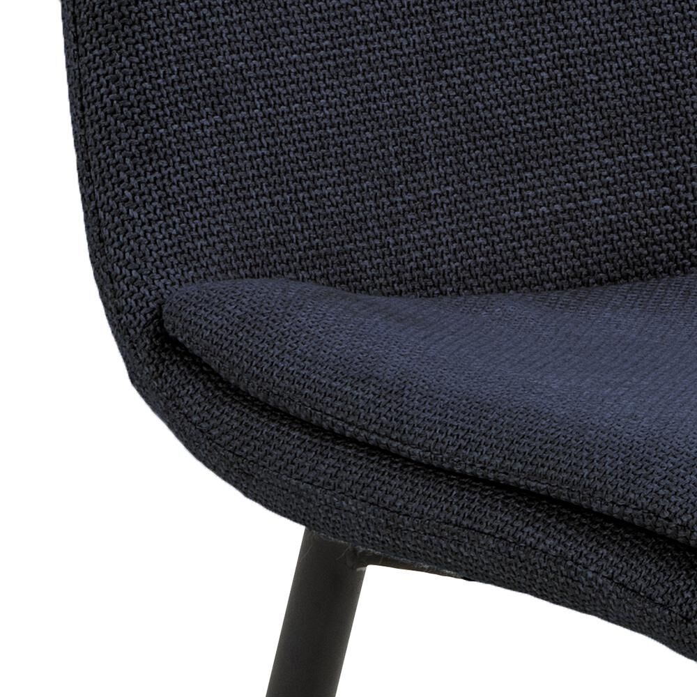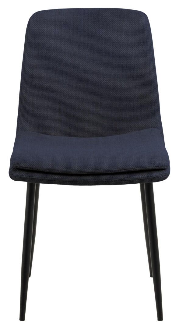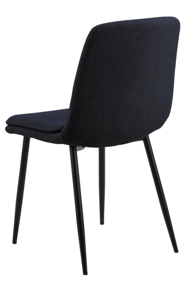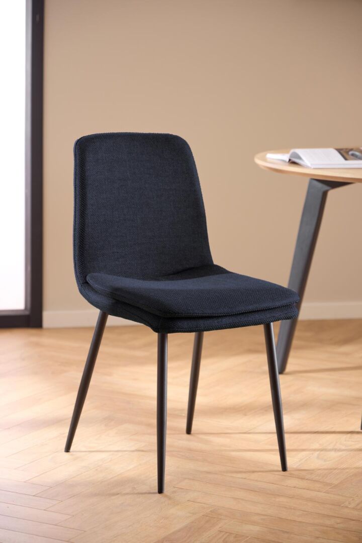 Ondersteunende rondingen, een stabiel frame en een zitvlak dat je meteen verwelkomt. Donkerblauwe, slijtvaste stof op slanke matzwarte stalen poten brengt rust én verfijning aan tafel; de subtiele stiknaden geven diepte.