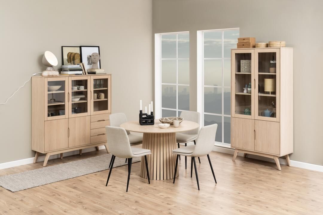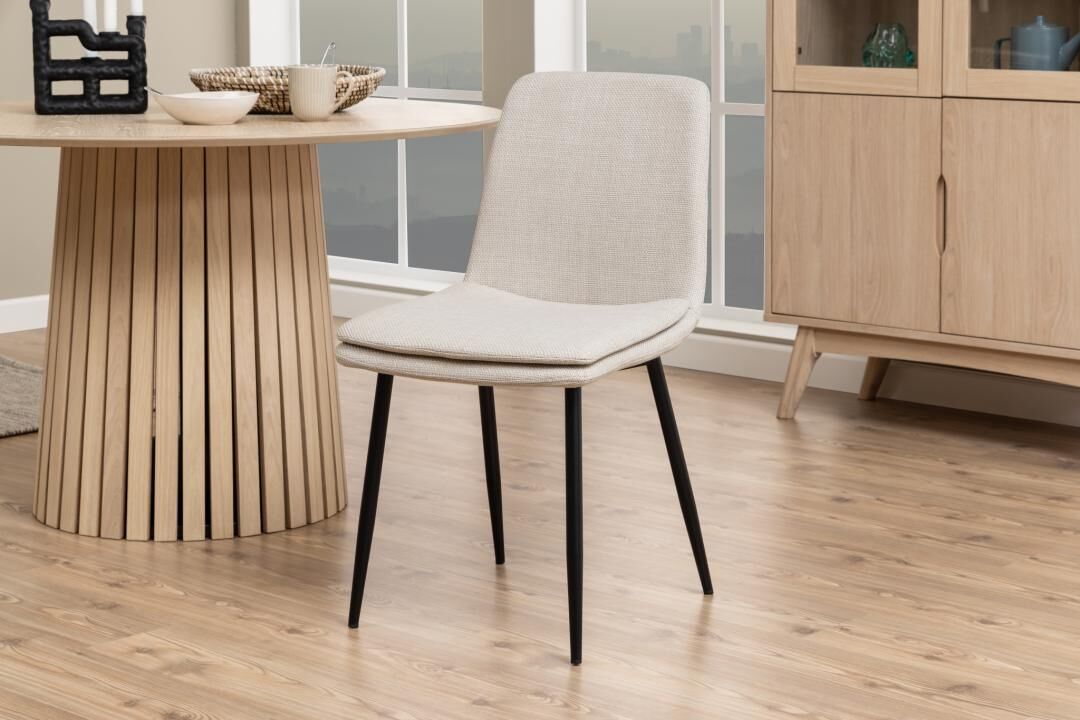 Strakke lijnen. Eerlijke materialen. Moeiteloze zit. Deze eigentijdse eetstoel in gestructureerd beige met slanke matzwarte poten brengt rust aan tafel en voelt meteen vertrouwd.