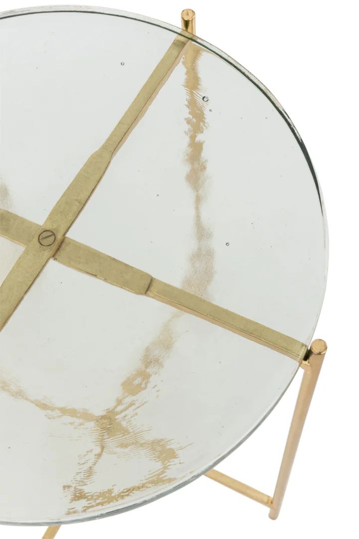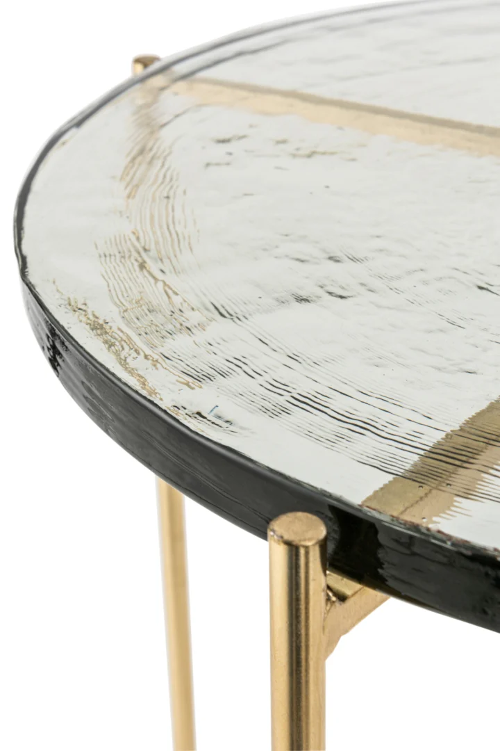 Breng een vleugje elegantie in huis met deze gouden bijzettafel. Het slanke glazen blad en het robuuste ijzeren onderstel maken hem zowel chic als praktisch voor elke dag.