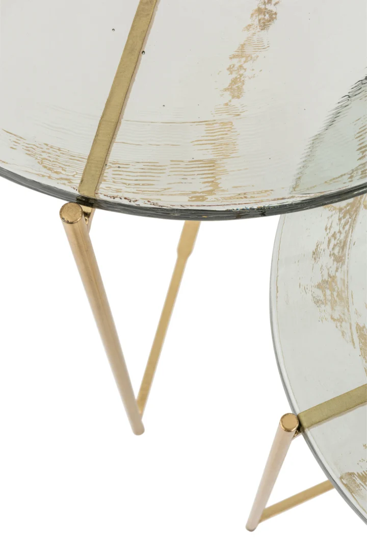 Materiaal: glas 40%, ijzer 60%. Onderhoud: afnemen met een zachte, licht vochtige doek; gebruik onderzetters om krassen te voorkomen. Niet bedoeld als zitmeubel. Kleur: goud.