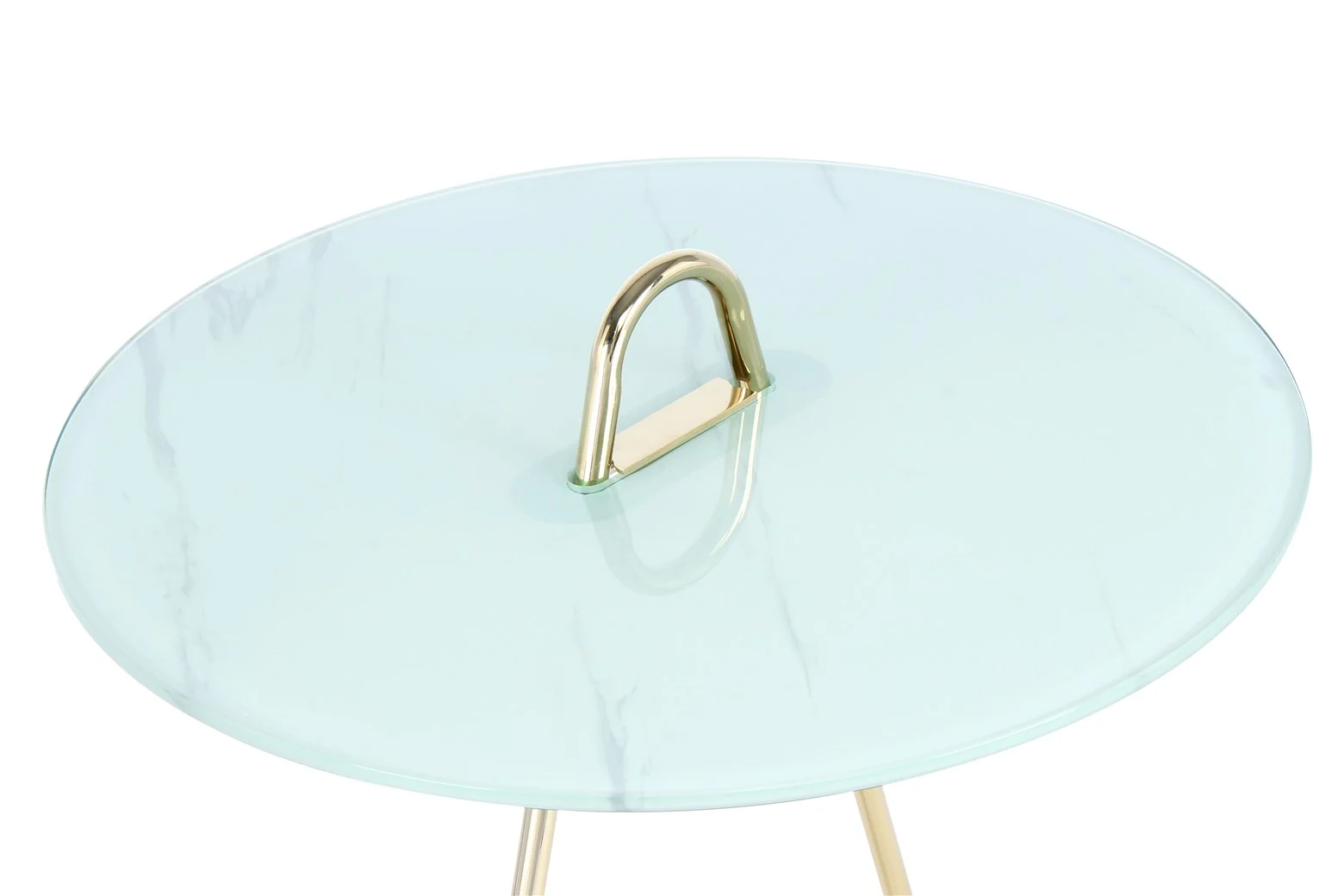 Geef je interieur instant allure met deze goud-witte bijzettafel. De marmerlook glasplaat en het pendelvormige stalen frame zorgen voor een elegante, luchtige uitstraling die moeiteloos past in elke kamer.