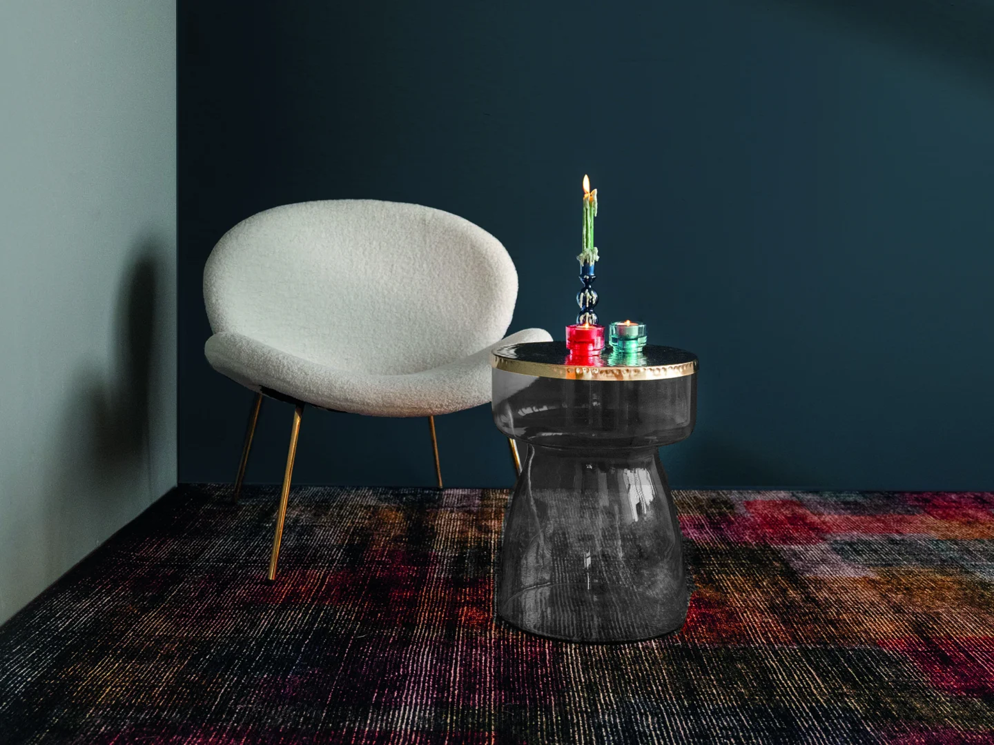 Deze bijzettafel komt goed tot zijn recht naast een fauteuil in een leeshoek. Het handgeblazen glas en het gouden blad zorgen voor een verfijnde uitstraling. Wel is het blad gevoelig voor vingerafdrukken. Geschikt voor liefhebbers van subtiele vintage accenten.