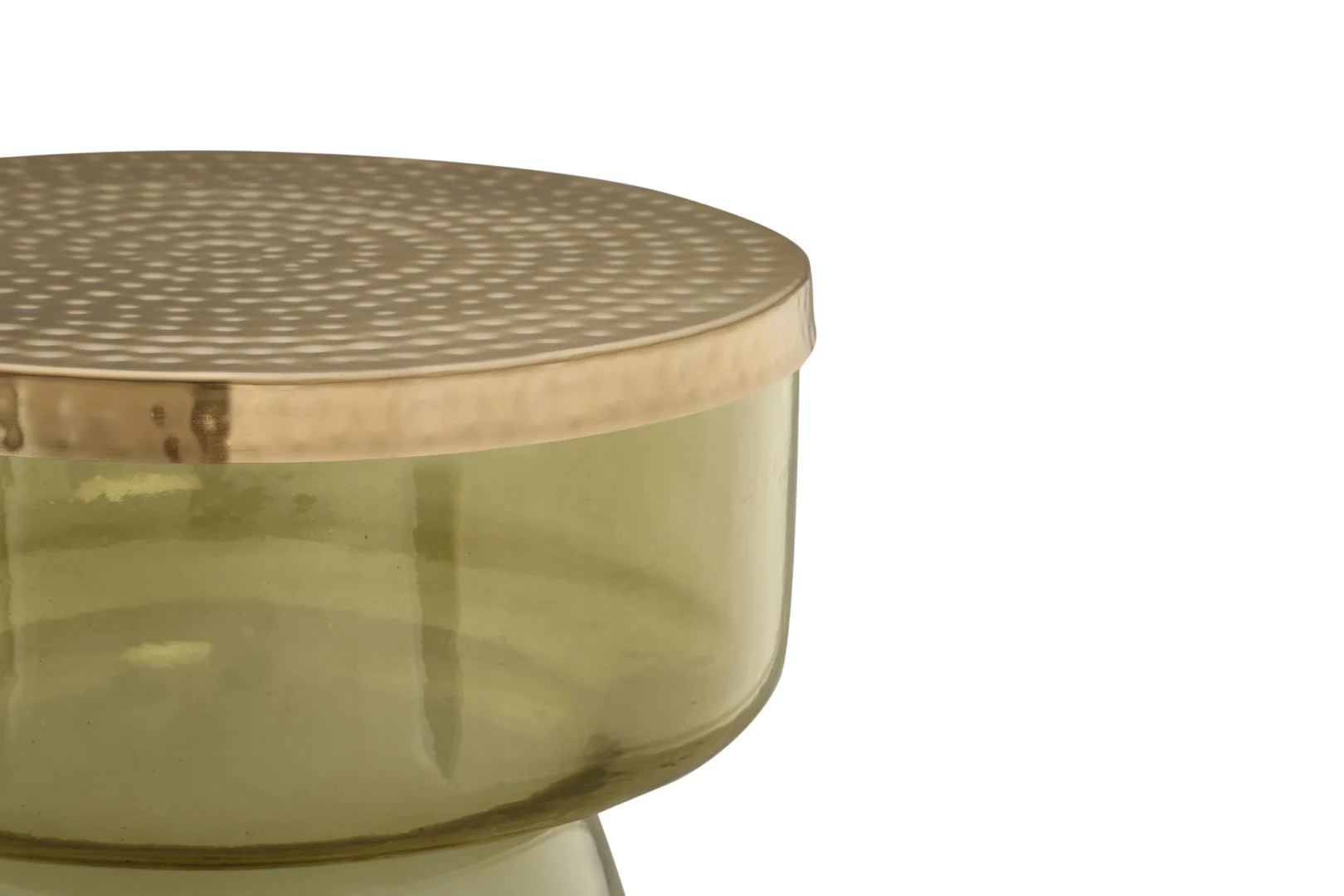 Geef je interieur een verfijnde twist met deze stijlvolle bijzettafel. Het groene, met de hand geblazen glas vormt een prachtige voet, terwijl het goudkleurige metalen blad een luxe accent toevoegt. Een retro-ontwerp met moderne uitstraling, perfect als blikvanger in elke ruimte.
