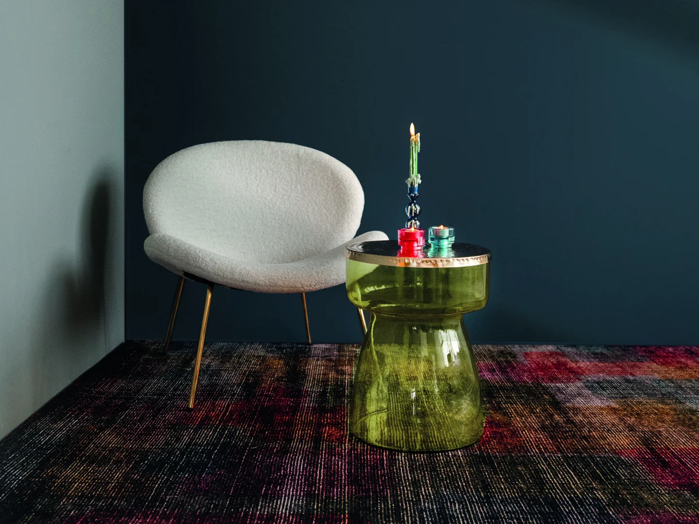 Deze bijzettafel komt mooi tot zijn recht naast een fluwelen fauteuil in een leeshoek. Het handgeblazen groene glas en het goudkleurige blad geven karakter en elegantie. Wel is het oppervlak gevoelig voor krasjes. Ideaal voor liefhebbers van retro en unieke accenten. Absoluut een charmante toevoeging.