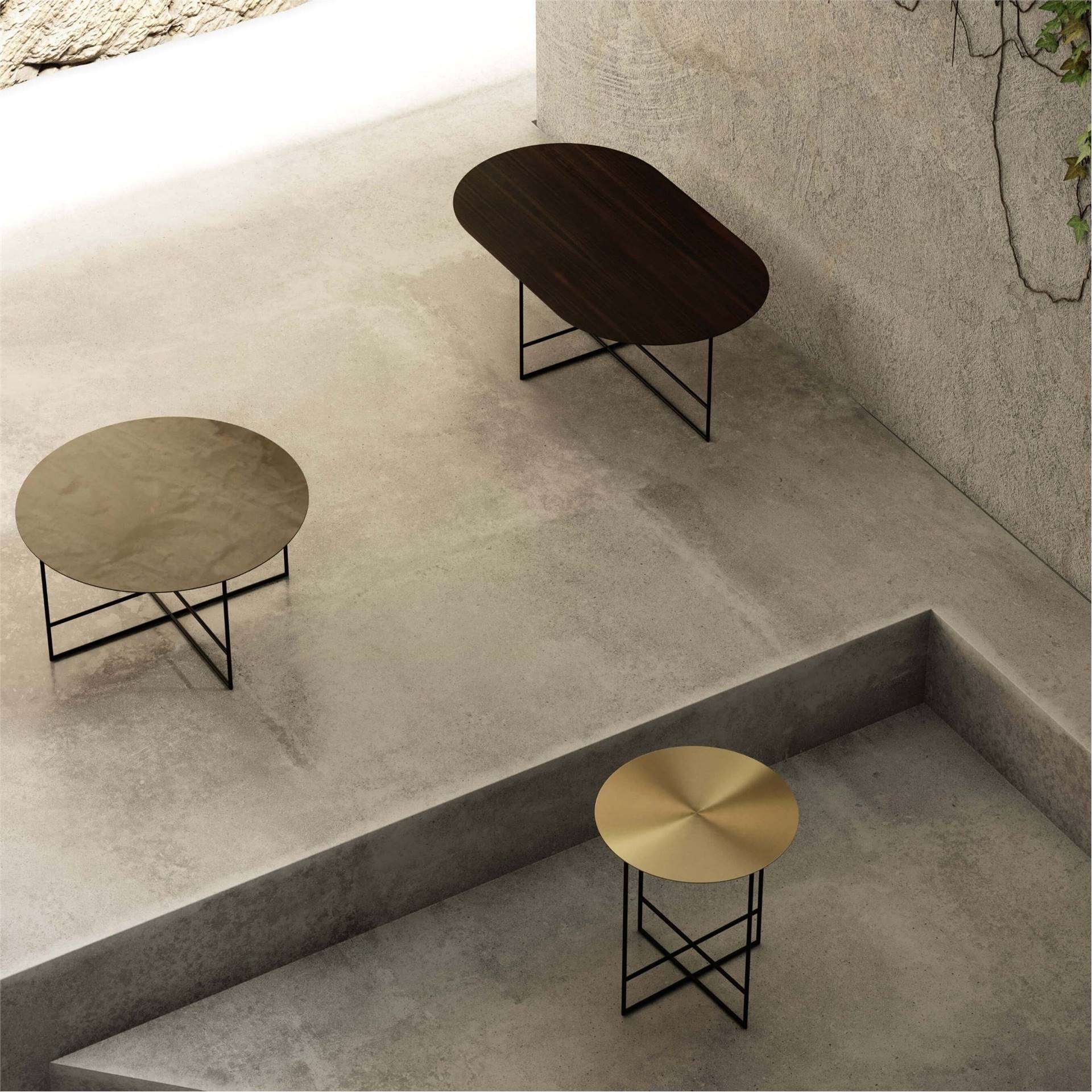 Moderne bijzettafel met gouden blad en minimalistisch zwart metalen onderstel. Perfect voor eigentijdse interieurinrichting.