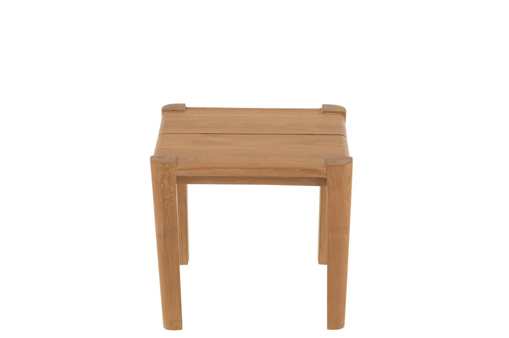 Compacte, stevige bijzettafel van teakhout; praktisch, maar niet stapelbaar.