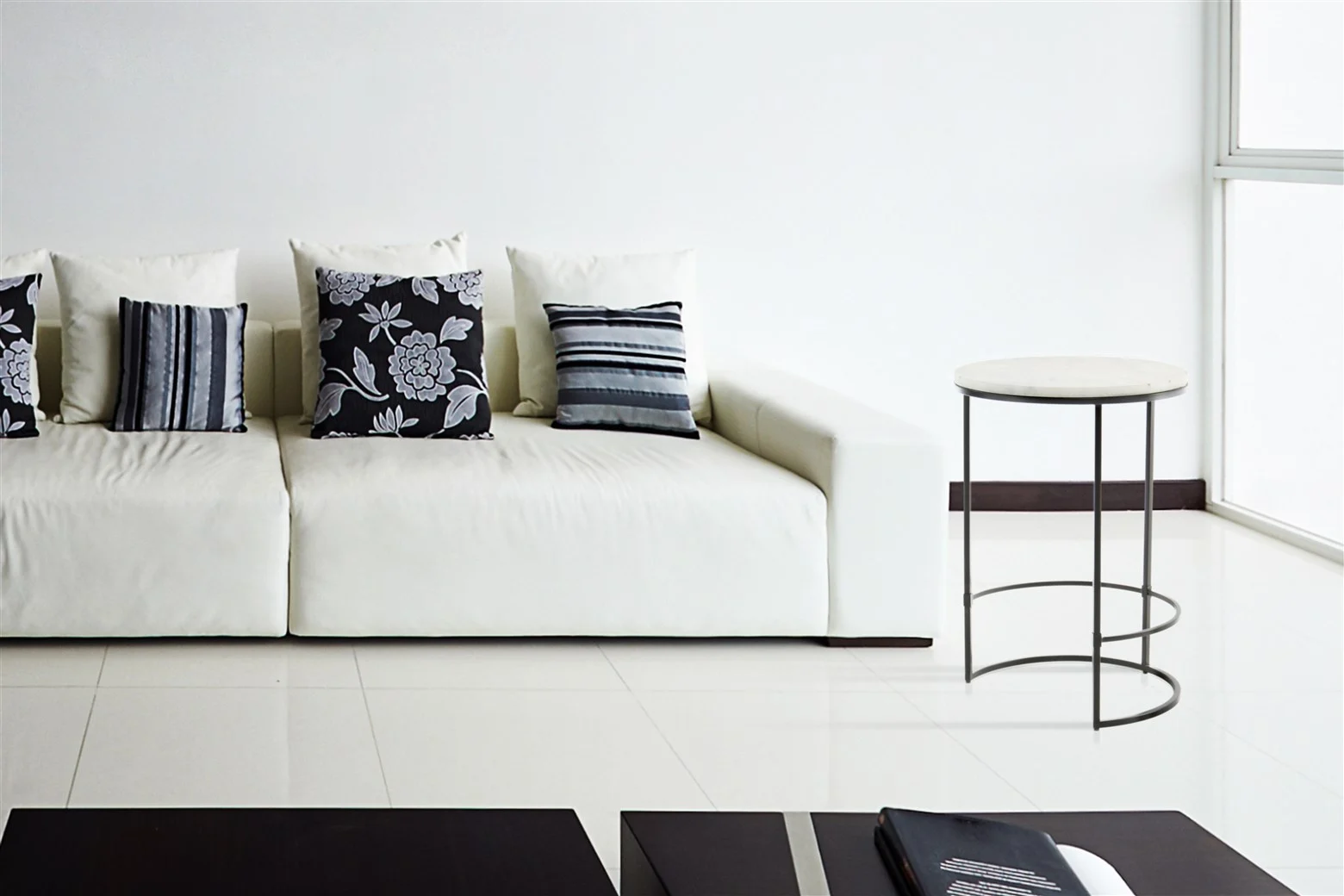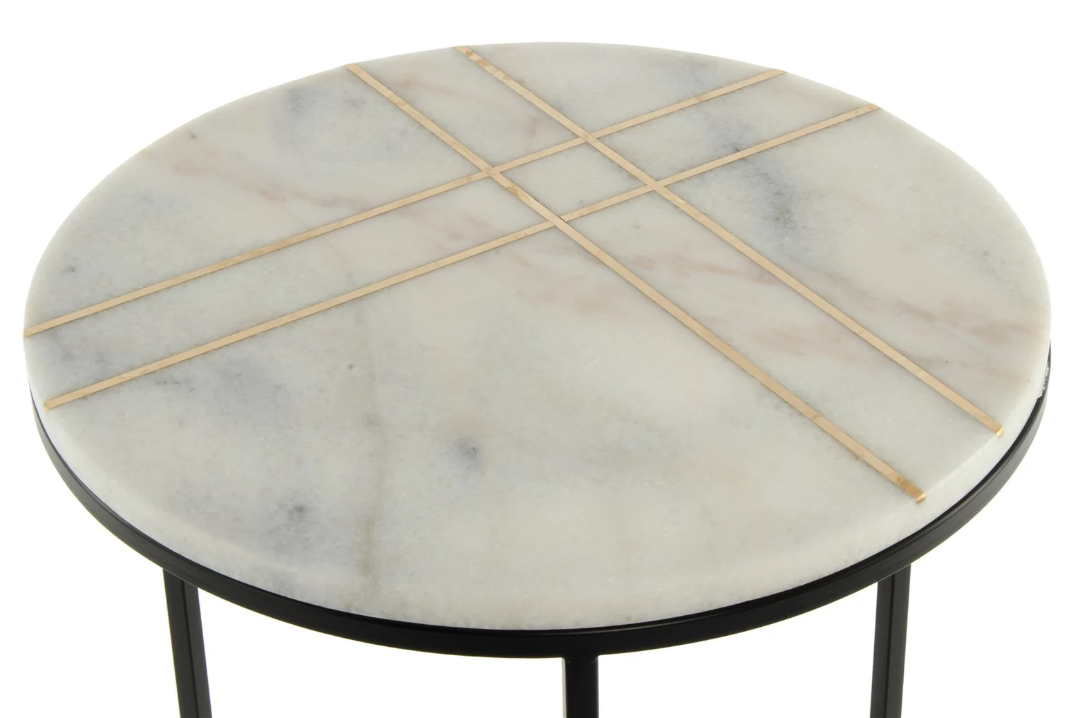 Geef je interieur een verfijnde update met deze elegante bijzettafel. Het witte marmeren blad en het slanke ijzeren frame brengen een luxe, rustige uitstraling die moeiteloos in elke woonstijl past.
