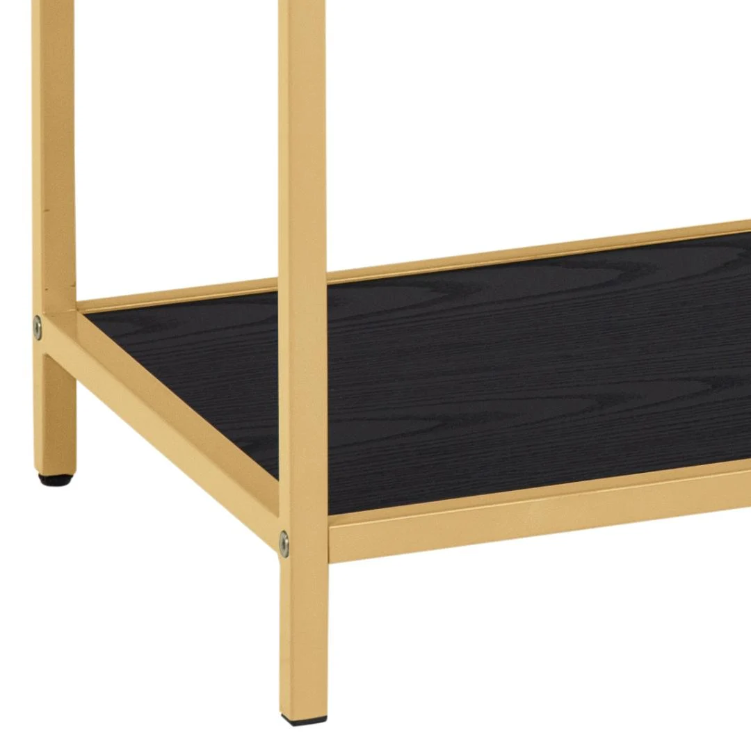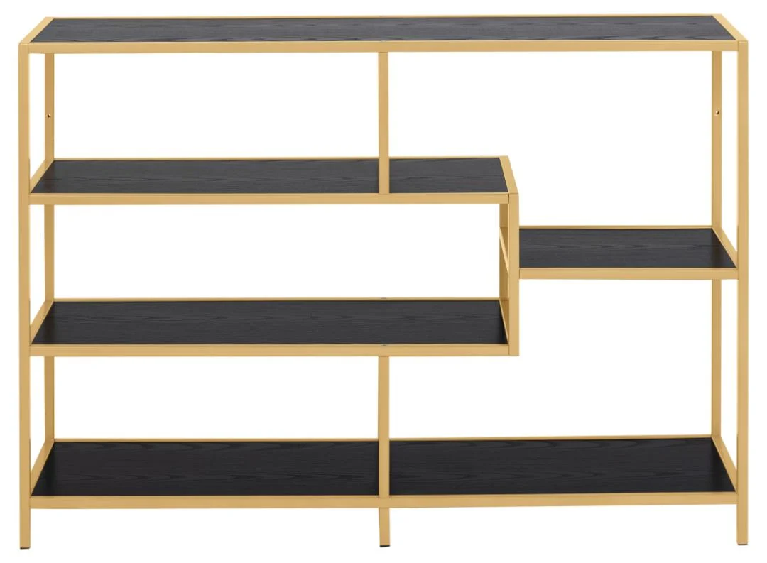 Op zoek naar een chique opberger die meteen sfeer brengt? Deze lage boekenkast combineert aszwart houtlook met een goudkleurig stalen frame voor een luxe accent in elke kamer.