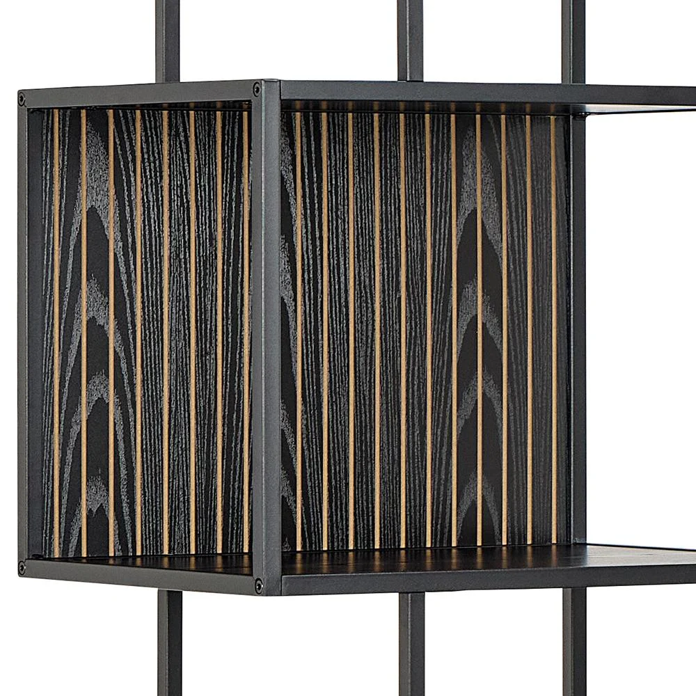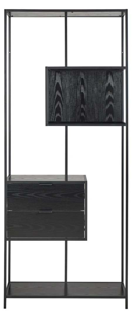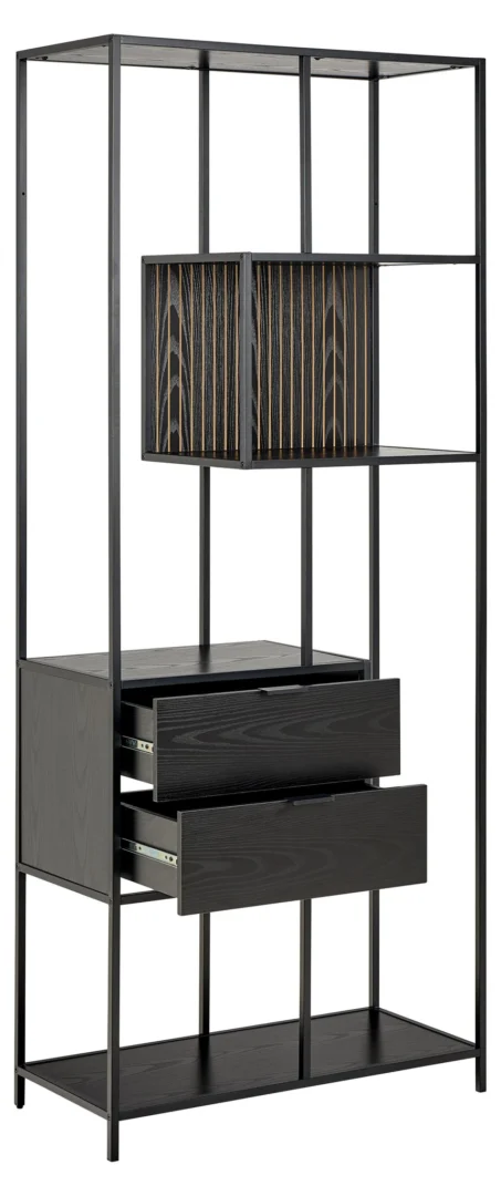 Op zoek naar een slanke boekenkast die elegantie en opberggemak combineert? Deze zwarte kast met mat stalen frame en aszwarte planken geeft je interieur een moderne, luchtige look. Dankzij het omkeerbare achterpaneel en het speelse asymmetrische design pas je de uitstraling in een handomdraai aan.