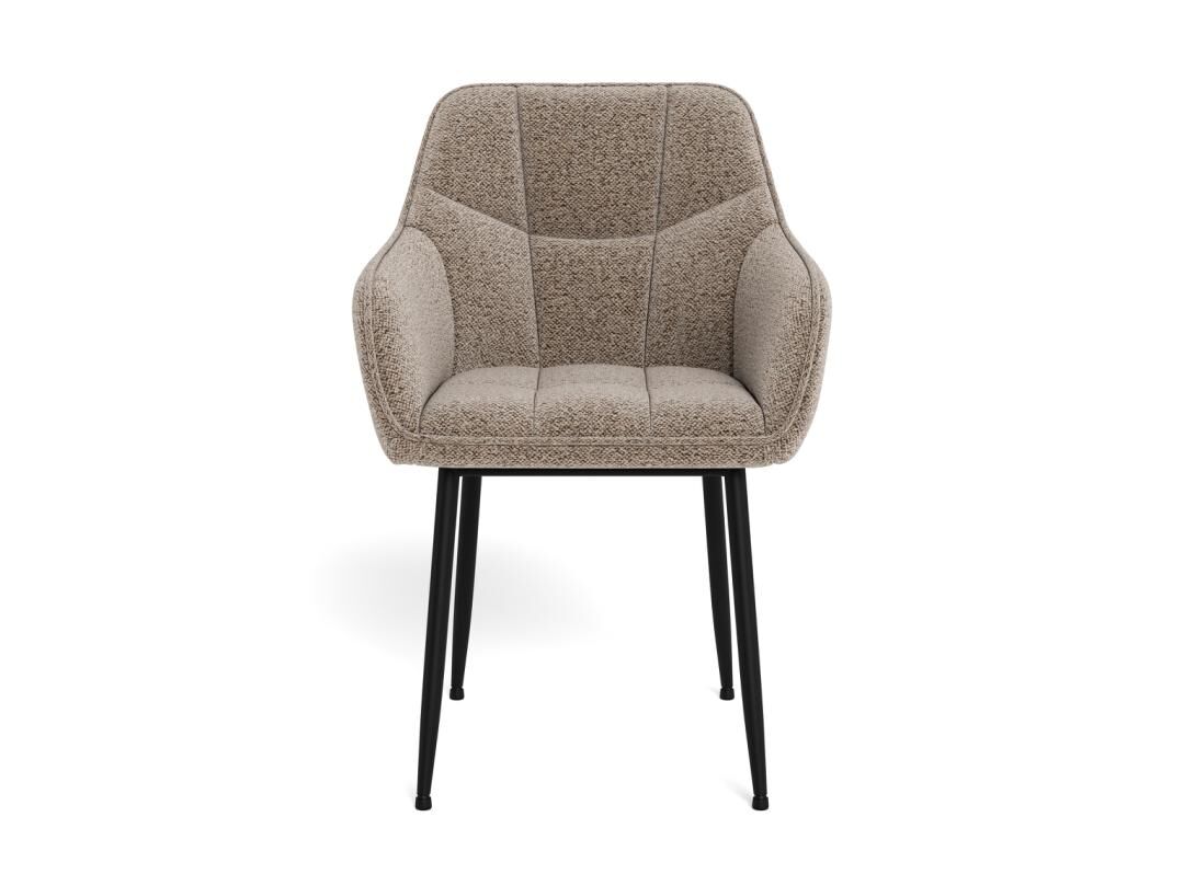 Ondersteunende rondingen, een stabiel frame en een zitvlak dat je welkom heet. Een eetkamerstoel met armleuningen in warm beige op matzwarte stalen poten.