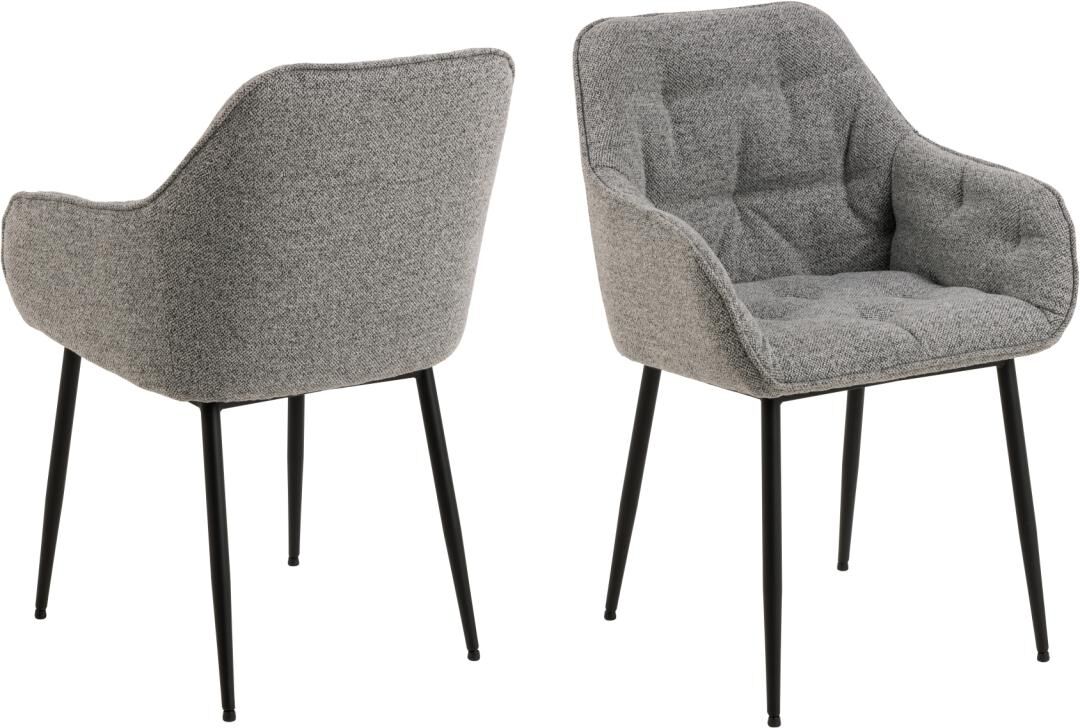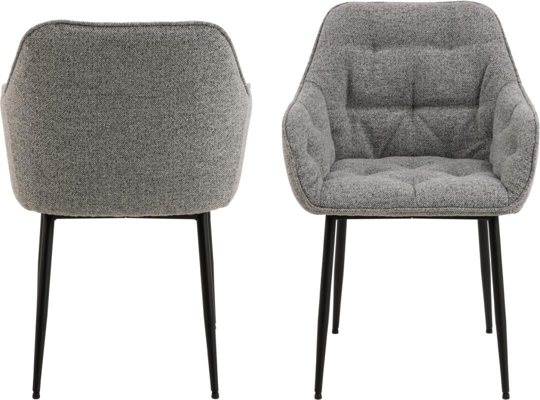 Materiaal & onderhoud: 96% polyester, 4% acryl; schoonmaken met een zachte, licht vochtige doek, vlekken deppen. Afmetingen: H83 x B58 x D55 cm; zithoogte 47; zitbreedte 41; zitdiepte 40,5; armhoogte 67 cm. Kleur: grijze bekleding, matzwarte poten. Verpakt per 2 stuks.