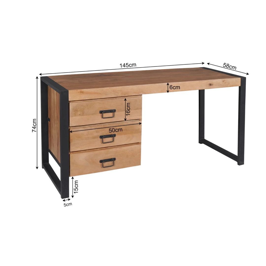 Ontdek een robuuste werkplek van massief mangohout: blad 145 bij 58 centimeter, hoogte 74 centimeter, drie ruime lades met zwarte metalen grepen. Warm, duurzaam materiaal; ideaal voor thuiswerken, studie of creatieve setups.