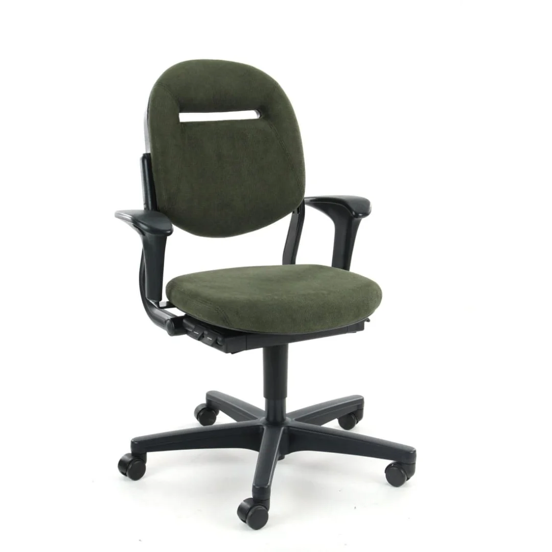 Soepele wielen, een frisse groene tint en steun waar je lichaam blij van wordt. Deze Workliving bureaustoel in groen is refurbished, ziet er als nieuw uit en heeft een standaard maat die onder de meeste bureaus past.