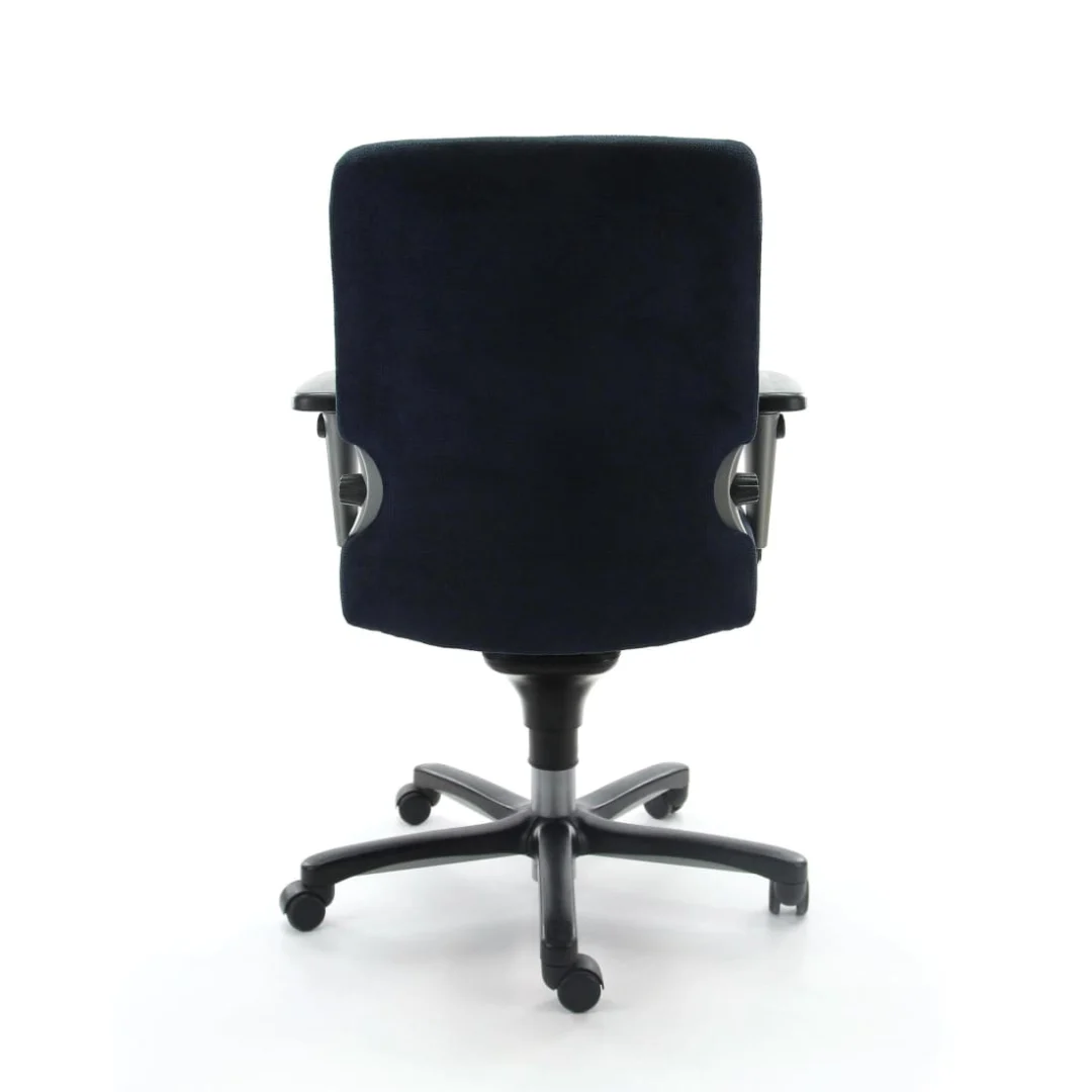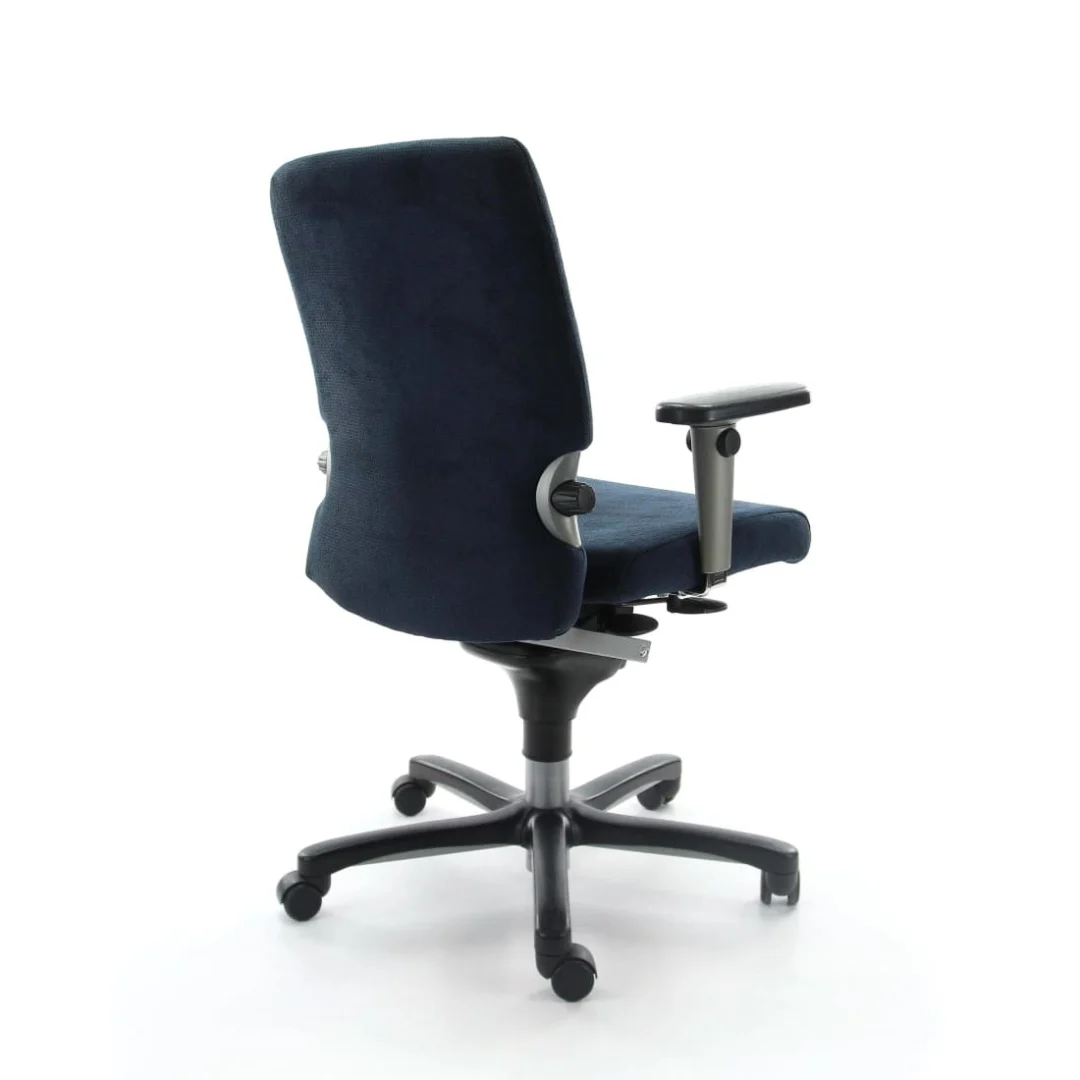 Stevige bureaustoel met goede ondersteuning; armleuningen missen verstelbare flexibiliteit.
