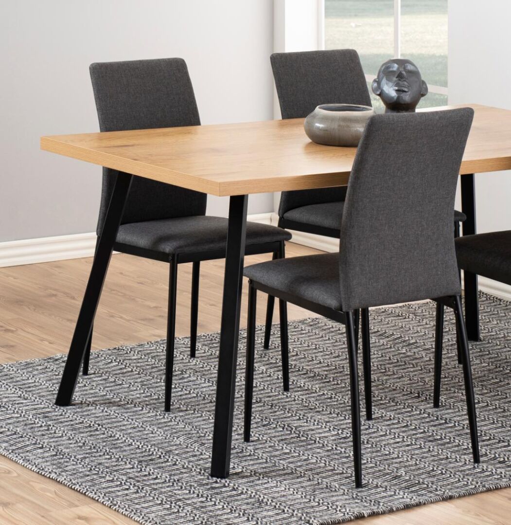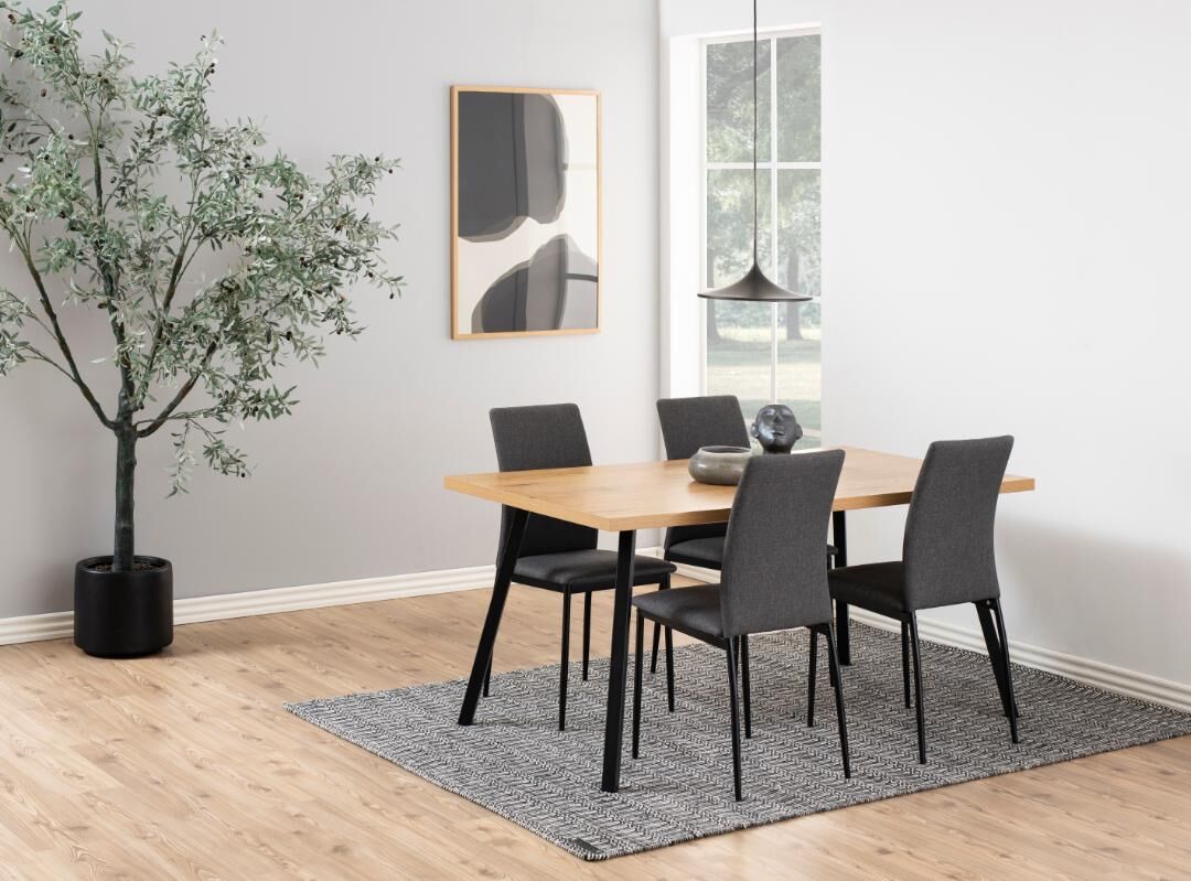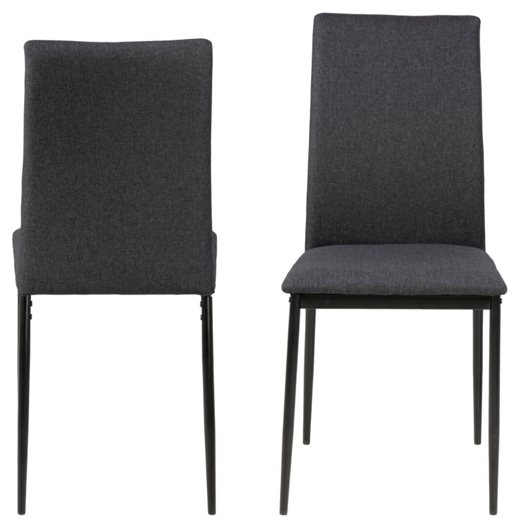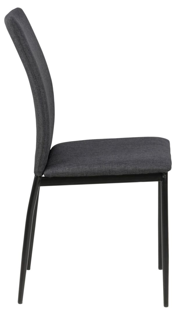 Steunende lijnen, een stabiel frame en een zit die je uitnodigt. Deze eetkamerstoel in zacht grijs textiel en slanke, zwart gepoedercoate poten brengt rust, comfort en moderne finesse rond elke tafel.