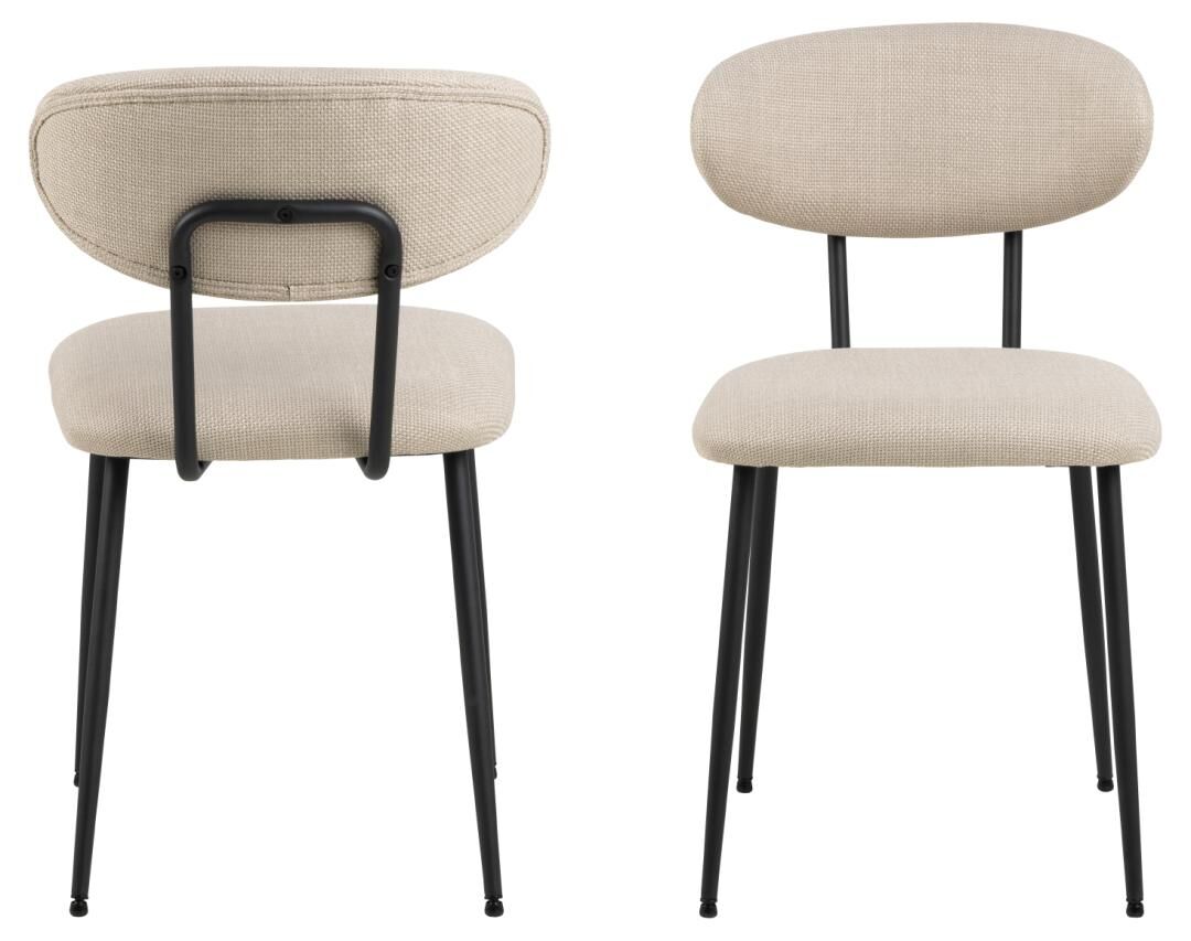 Eetkamerstoel in gestructureerde beige stof (100% polyester) met slanke, matzwarte stalen poten (ruw gepoedercoat) en plastic pootdoppen. Comfortabel en stevig (tot 110 kg), slijtvaste bekleding (Martindale >50.000). Zithoogte 49 cm, zit 43×43 cm. Voeg tijdloze stijl en comfort toe aan je eethoek.
