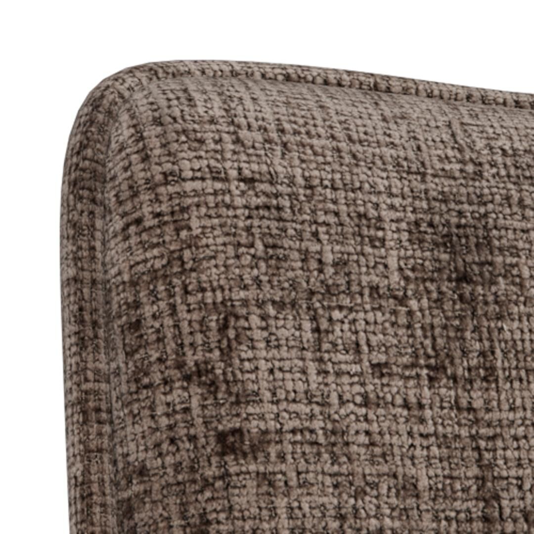 De gedempt bruine juto-look stoffering (100% polyester) met fijne piping oogt warm en blijft mooi; de matzwarte vierster-voet in ruw gepoedercoat staal voegt moderne finesse toe.
