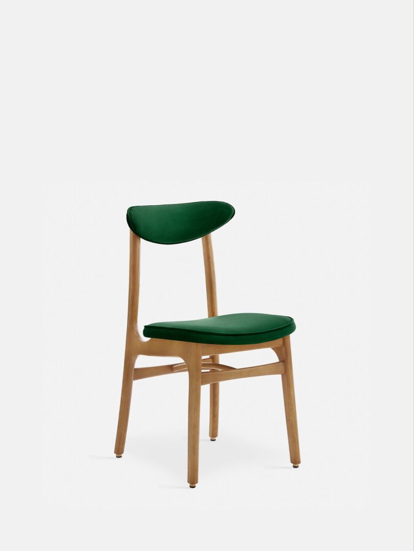 Materiaal & onderhoud: fluweel en hout; afnemen met zachte doek, vlekken lokaal reinigen. Afmetingen: H82 x B45 x D52 cm; zithoogte voor standaard eettafels. Kleur: flesgroen met hout naturel. Compatibiliteit: combineert makkelijk met diverse tafels en gemixte zitsets.