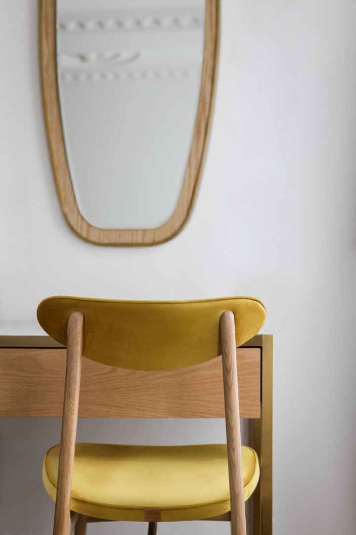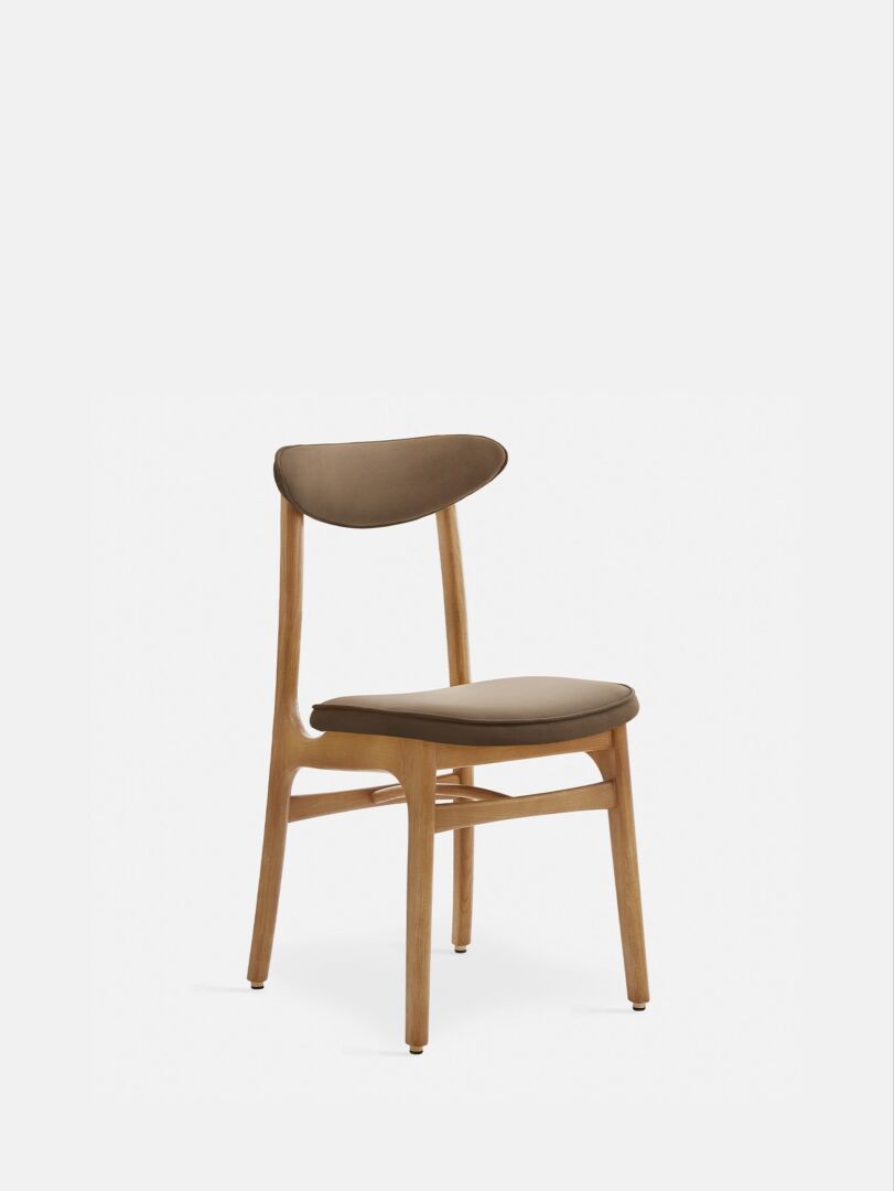 Strakke lijnen. Eerlijke materialen. Moeiteloos zitgemak. Deze eetkamerstoel in zacht taupe fluweel met naturel houten poten brengt rust aan tafel en nodigt uit tot lange, ontspannen gesprekken.