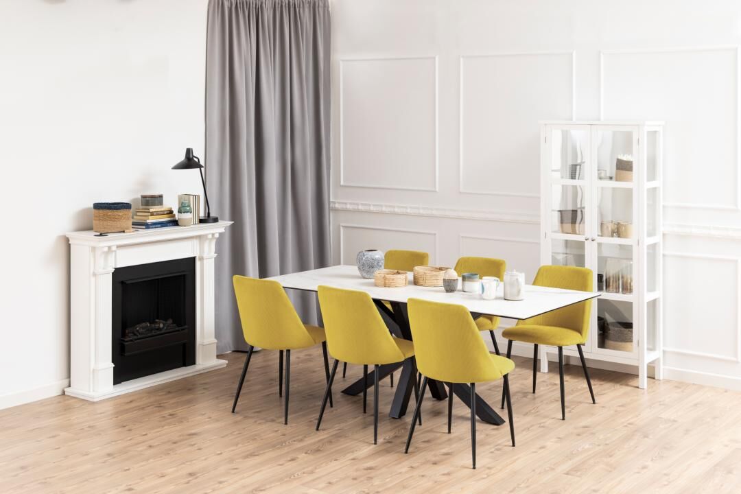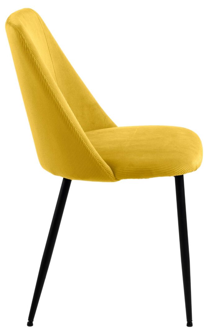 Materiaal & onderhoud: 100% polyester ribstof; stalen poten. Reinigen met zachte, licht vochtige doek; vlekken deppen. Afmetingen: H 84 x B 49,2 x D 57,5 cm; zithoogte ca. 48,5 cm. Kleur: kerrie/oranje met matzwarte poten. Past bij houten en zwarte tafels; combineer met barkrukken of armstoelen.