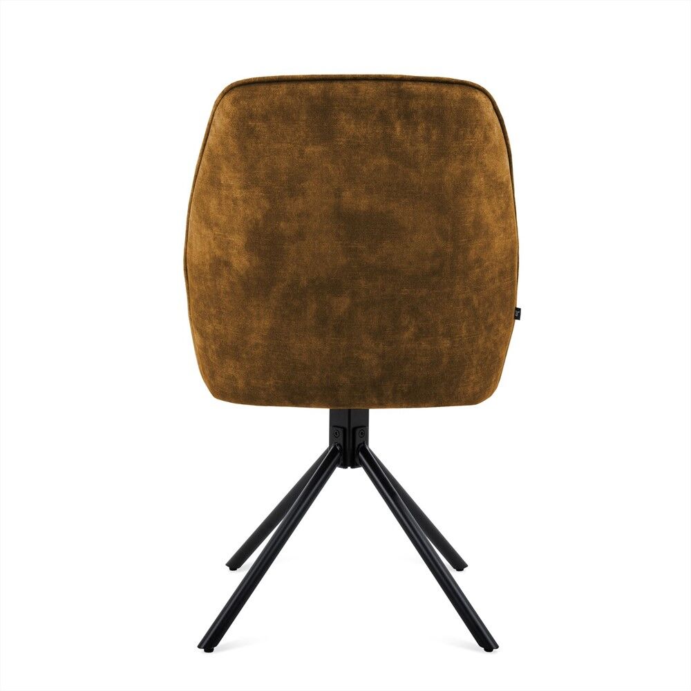 Comfortabele eetkamerstoel met zachte stof en stevige rugleuning; iets lage zit. Geschikt voor dagelijks gebruik aan de eettafel.