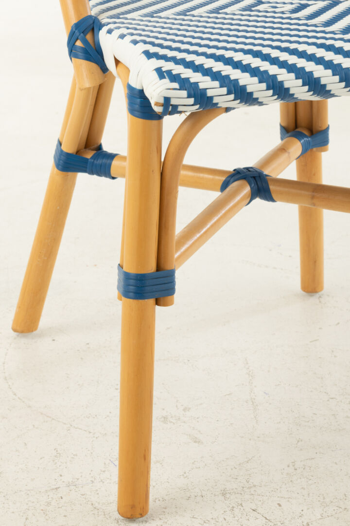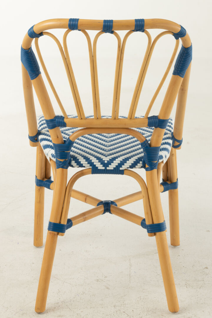 Materiaal & onderhoud: rotan/kunststof; afnemen met een zachte (licht) vochtige doek; buiten alleen onder overkapping, niet in regen. Afmetingen: H85 x B56 x D47 cm; draagkracht 150 kg. Kleur: blauw/wit. Collectie: Été 2025. Levering: ca. 5 dagen. Combineert mooi met houten eettafels, banken of een mix van zitmeubels.