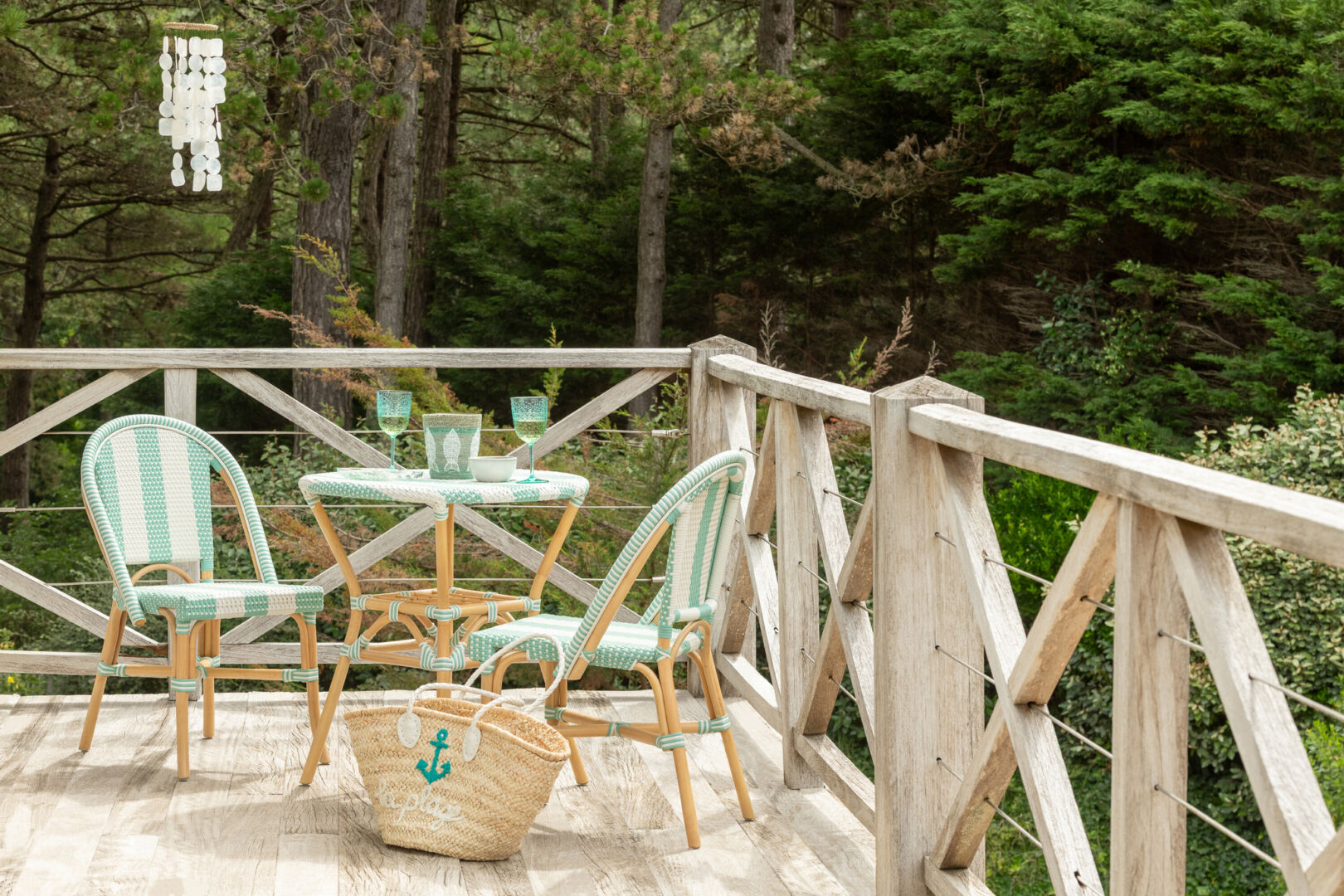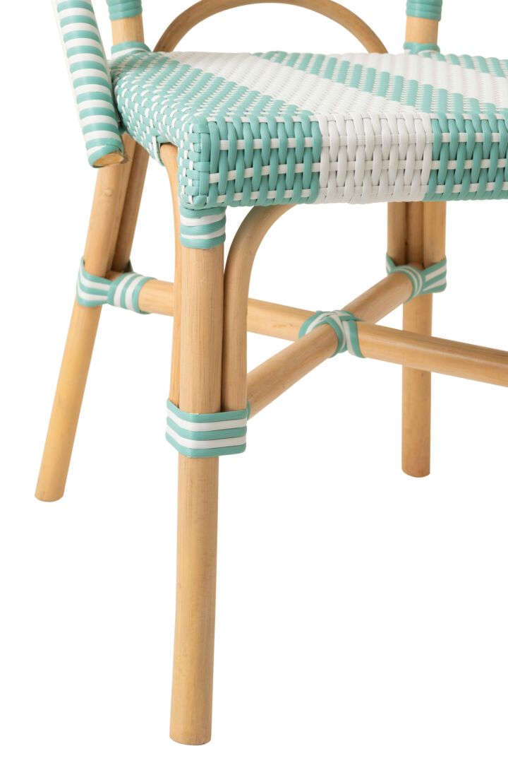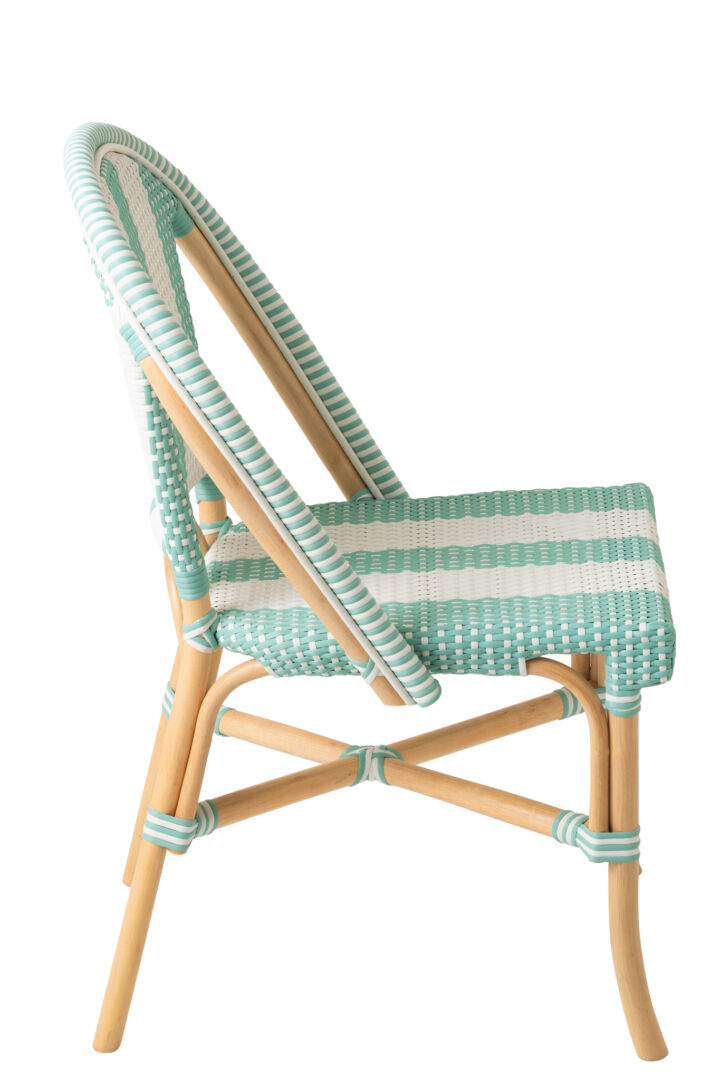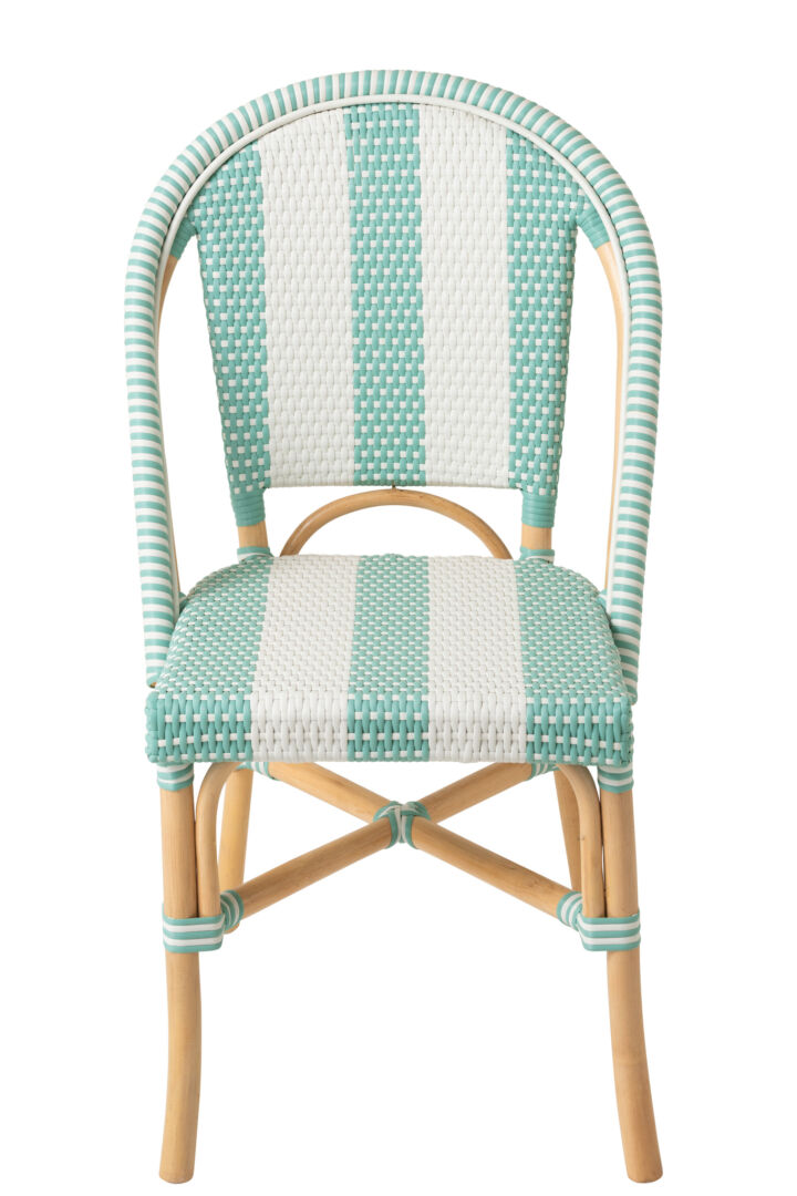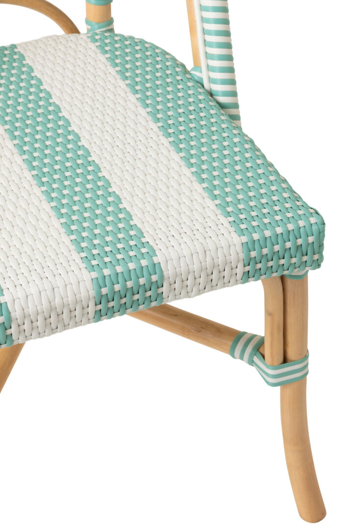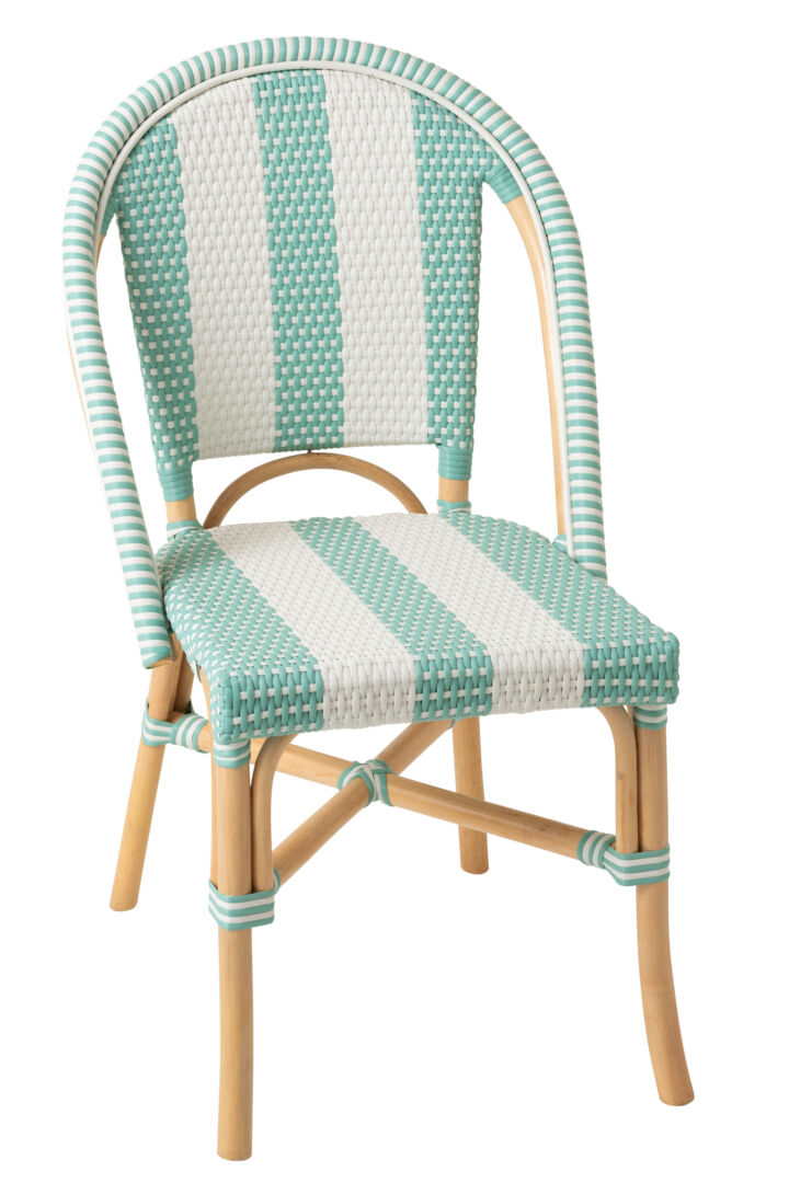 Deze zijstoel verenigt rotan met vormvast kunststof in een fris lichtblauw-wit streepdesign. De zachte rugcurve en uitgebalanceerde zit ondersteunen zonder te dwingen.