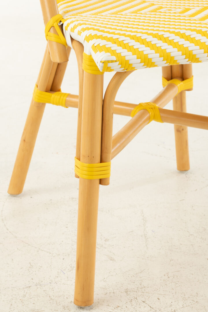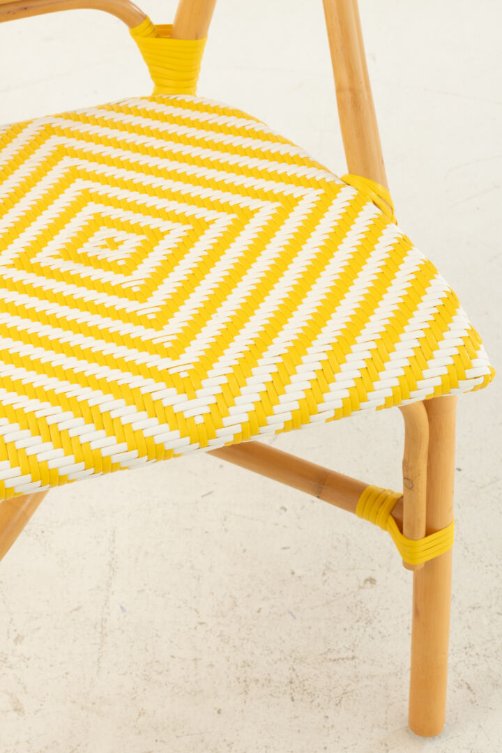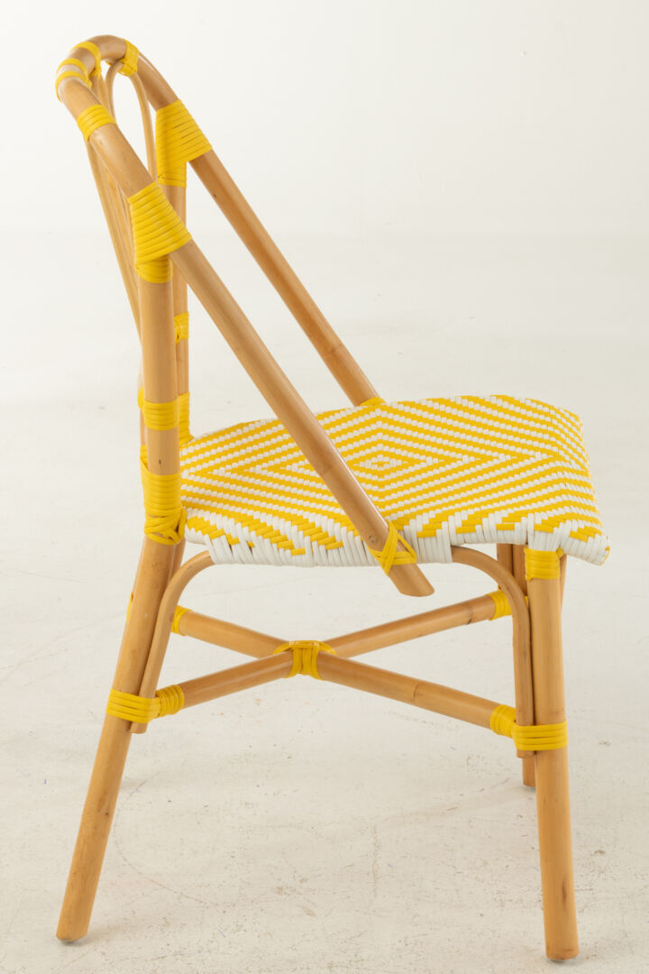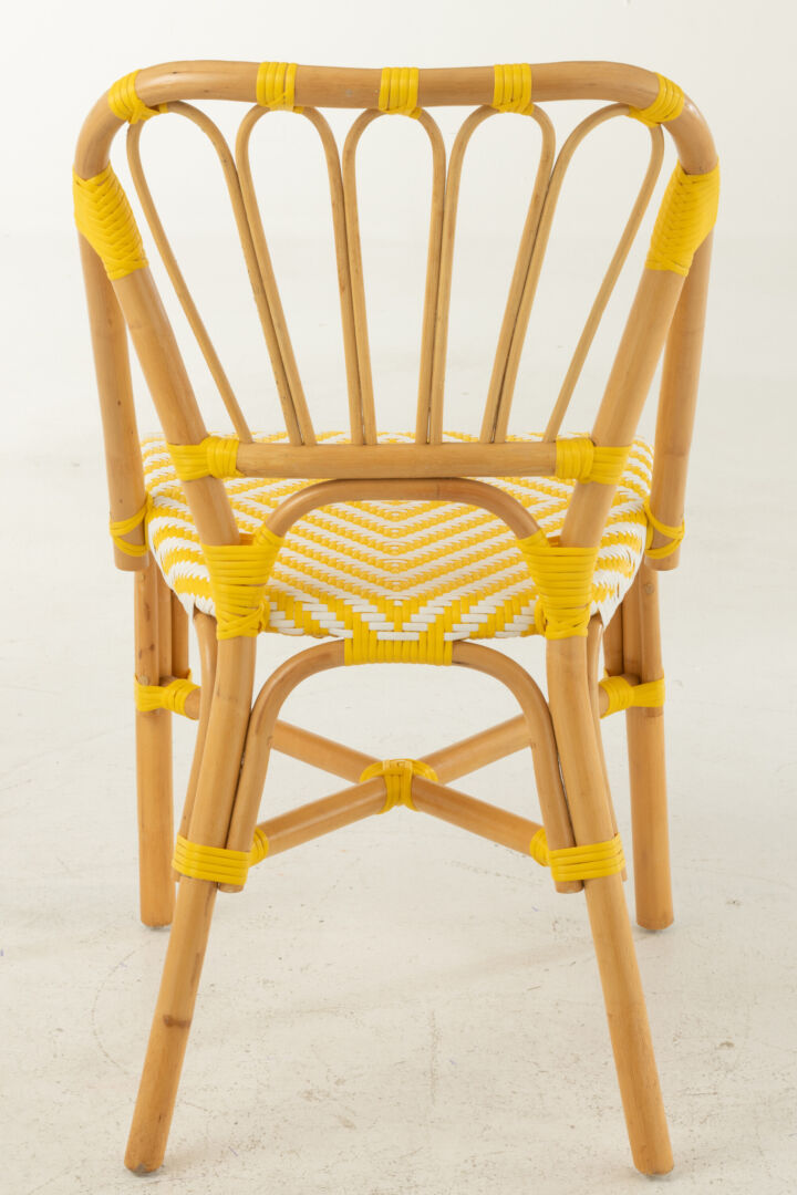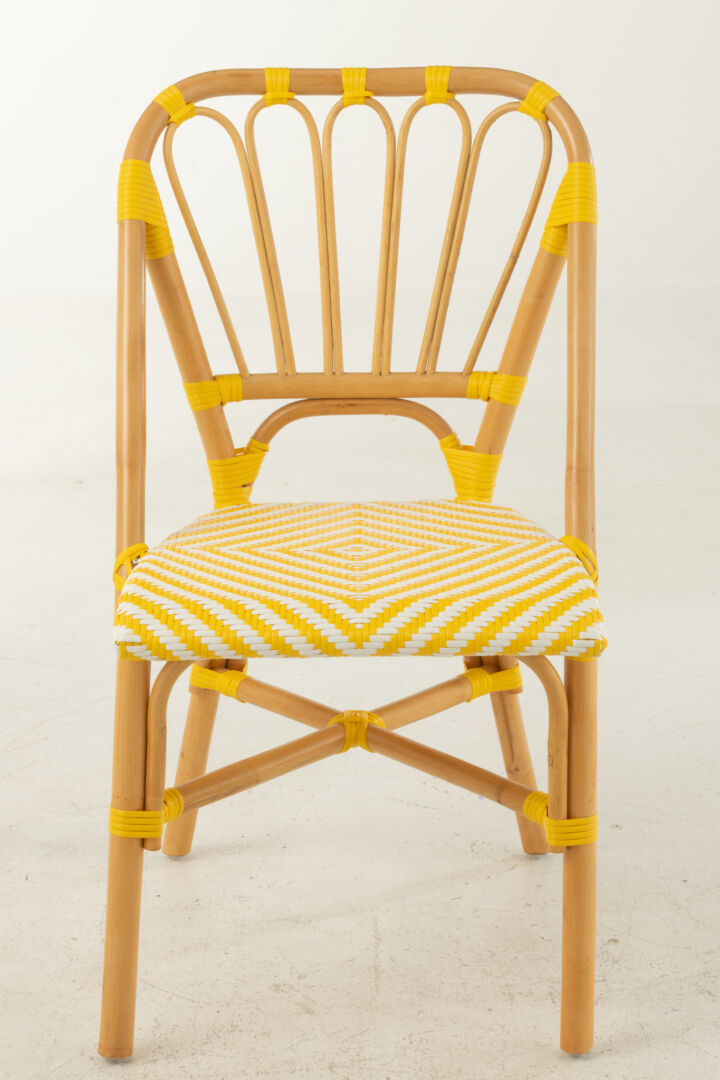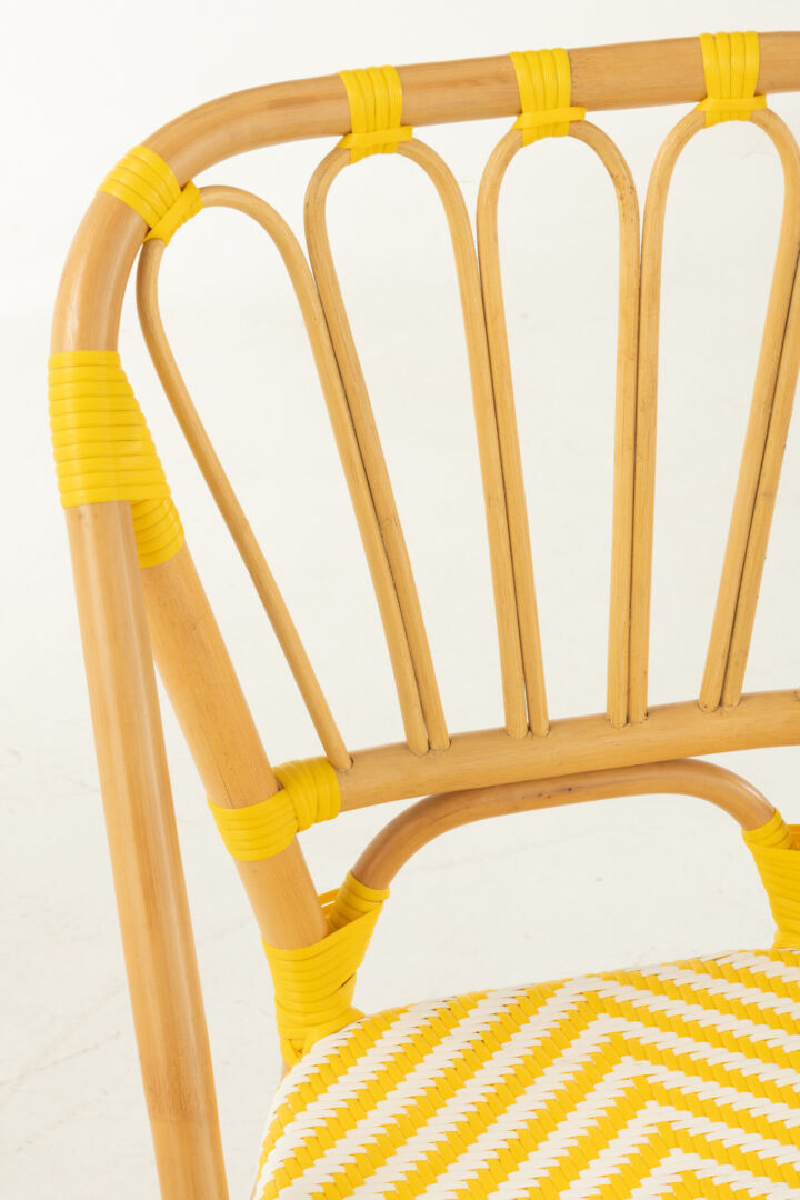 - Afwerking: zichtbare rotanstructuur; frisse geel/witte tint