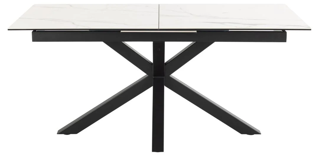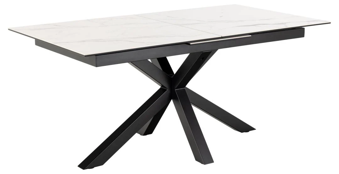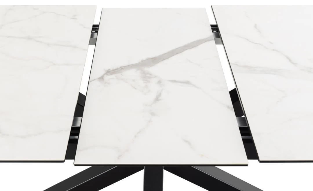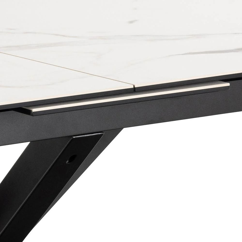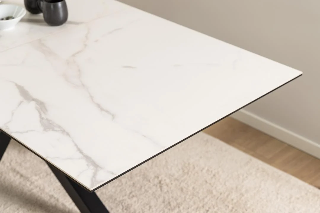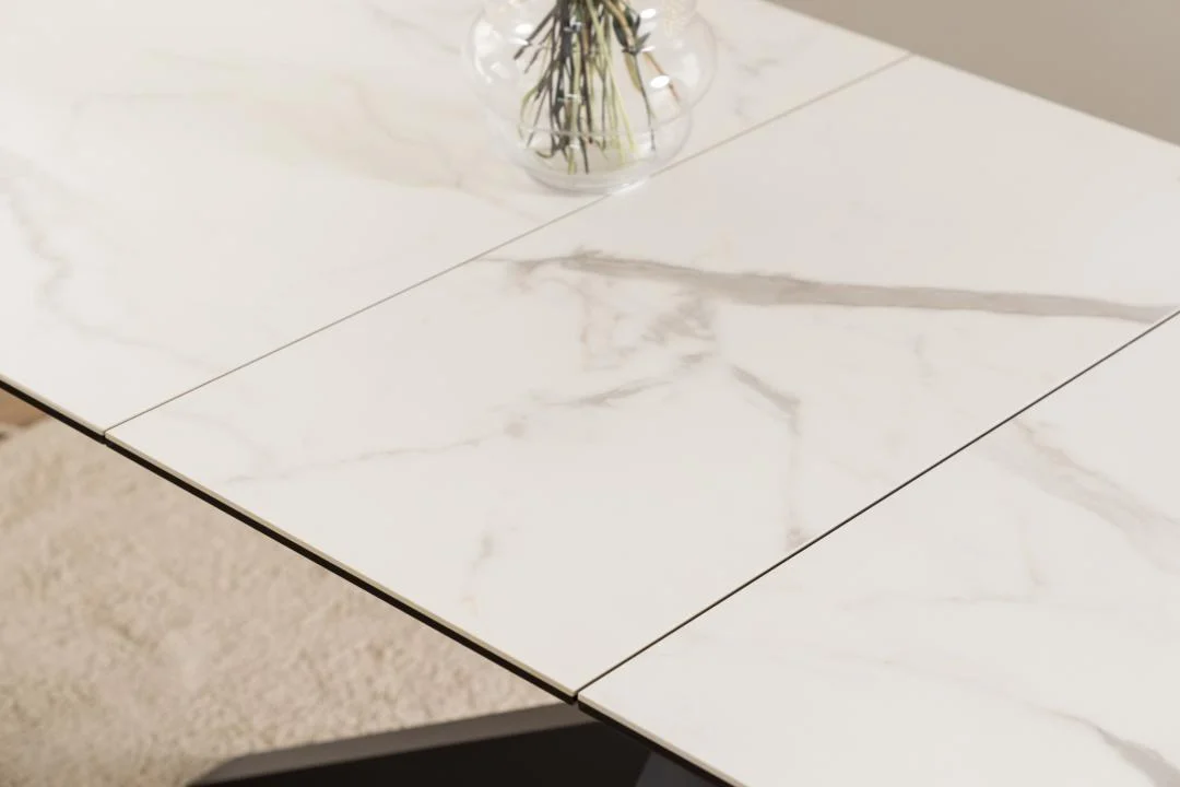 Strak vormgegeven eettafel met handig uitschuifblad; het keramische oppervlak is stijlvol maar gevoelig voor vlekken.