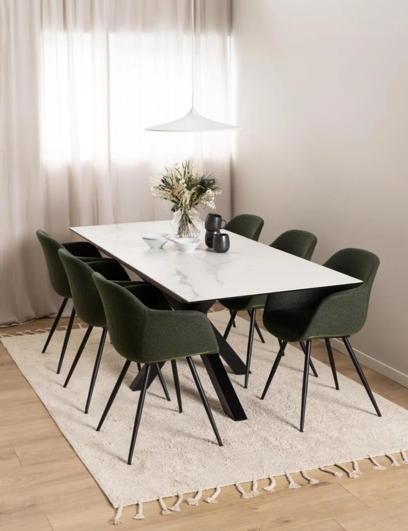 Breng tijdloze elegantie aan tafel met deze rechthoekige eettafel in Witte Akranes. Het slijtvaste keramische blad op glas en de matzwarte stalen poten geven een moderne, gezellige uitstraling die moeiteloos in je interieur past.