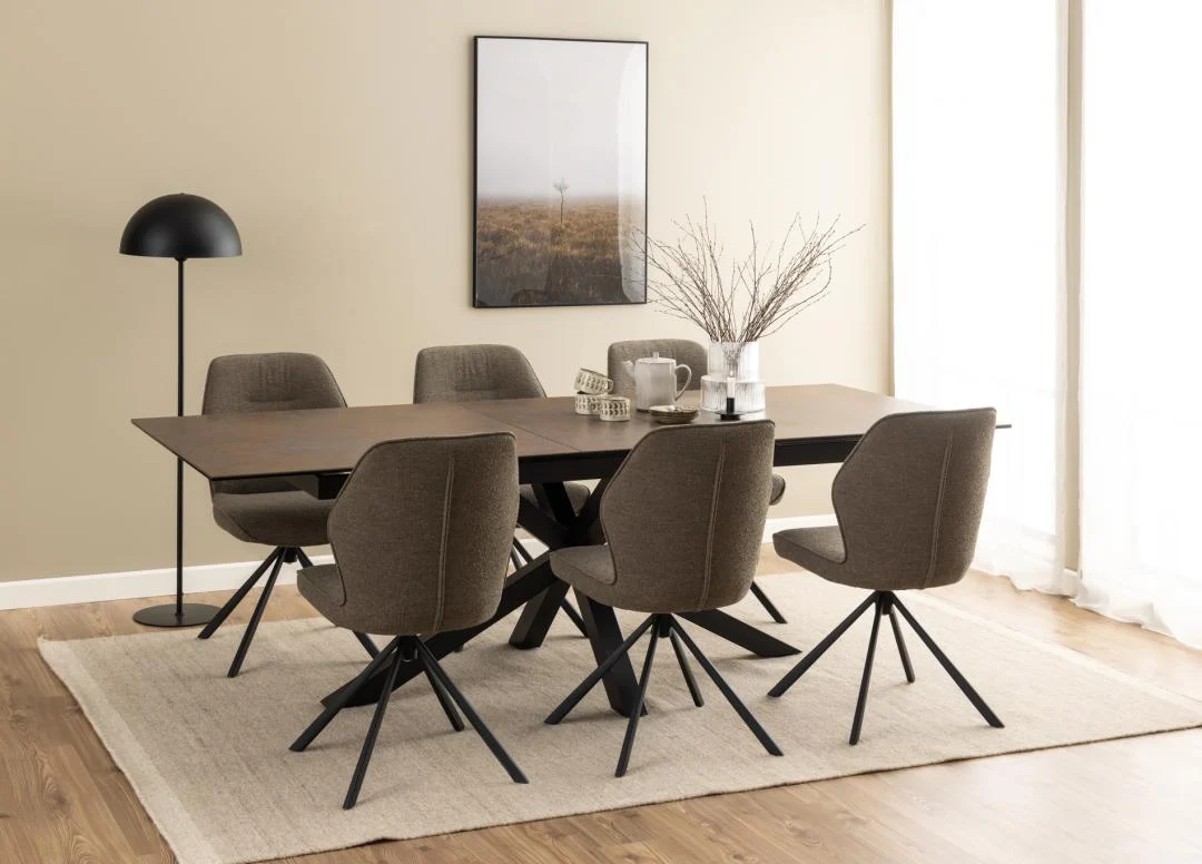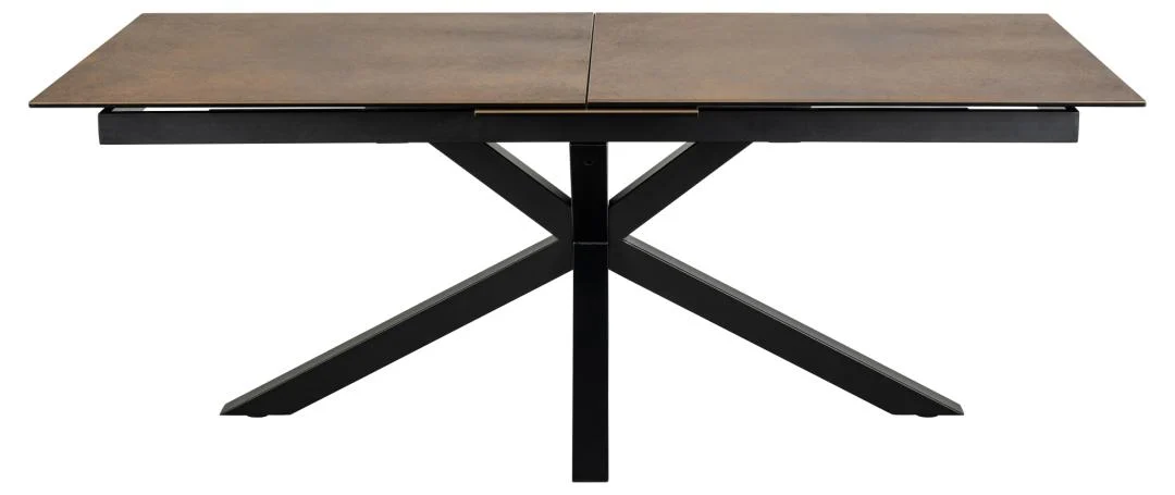 Gezellig samen tafelen krijgt een stoere upgrade met deze rechthoekige eettafel in roestbruin keramiek en matzwarte stalen poten. Het royale blad biedt ruimte voor grote gezelschappen en groeit met je mee dankzij het slimme verlengsysteem.
