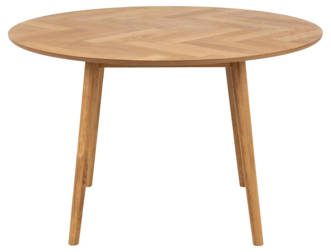 Deze ronde eettafel biedt voldoende ruimte voor dagelijks gebruik in kleinere keukens. De visgraatafwerking oogt stijlvol en de eiken poten zorgen voor stabiliteit. Door het MDF-blad is ze iets gevoeliger voor krassen. Geschikt voor wie compact en sfeervol wil dineren.