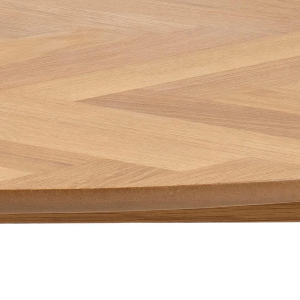 Deze ronde eettafel zorgt voor sfeervolle diners in kleinere eetruimtes. Het visgraatpatroon en de warme geoliede afwerking geven karakter, terwijl de stevige constructie stabiliteit biedt. Minder geschikt voor wie veel tafelruimte zoekt. Ideaal voor stijlvolle, compacte interieurs. Aanrader.