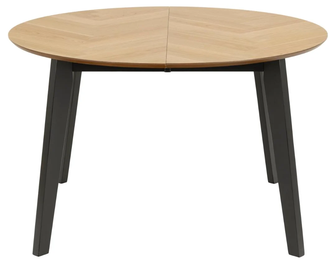 Maak van elke maaltijd een moment met deze ronde eettafel in natuurlijke houttint. Het visgraatblad in mat eiken oogt warm en modern, terwijl de matzwarte poten voor een stoere touch zorgen. Met Ø120 cm is hij compact, en met de twee verlengbladen groeit hij in een handomdraai mee met je gezelschap.