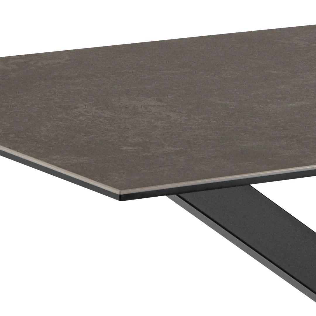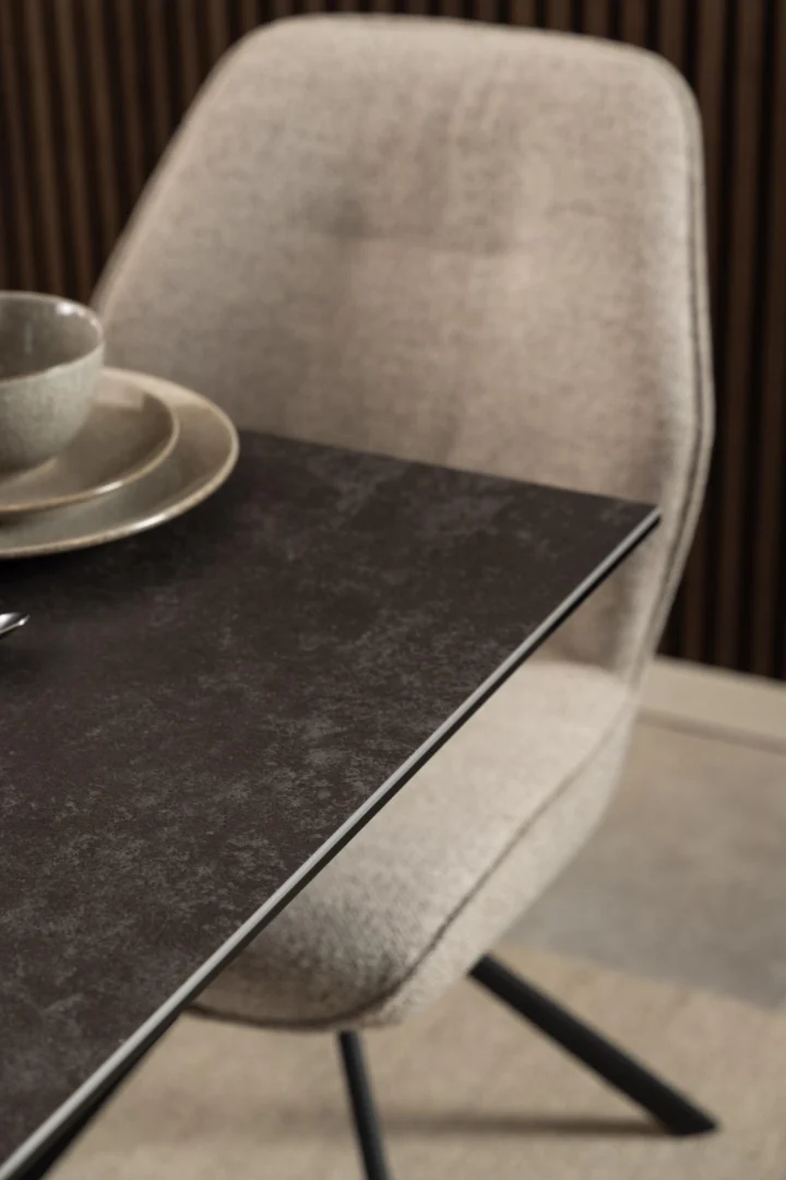 Deze eettafel biedt tijdens een diner met vrienden een stabiele ondergrond en moderne uitstraling. Het keramische blad is onderhoudsvriendelijk en krasbestendig, terwijl de stalen poten stevig staan. Minder geschikt voor kleinere ruimtes. Ideaal voor liefhebbers van strak en functioneel design.