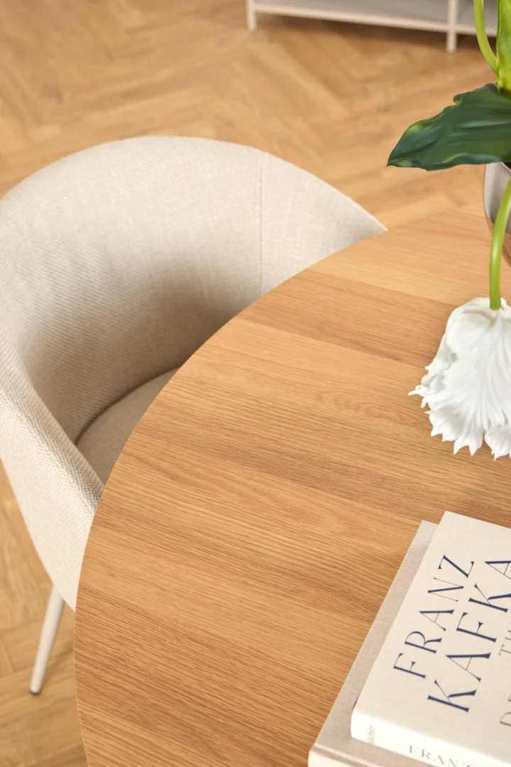 Deze ronde eettafel komt perfect tot zijn recht in kleinere eetkamers of keukens waar gezelligheid telt. Het mat eiken fineer voelt warm aan, en de stalen voet geeft stabiliteit. Montage kost wat tijd. Ideaal voor wie stijl met stevigheid combineert. Aanrader.