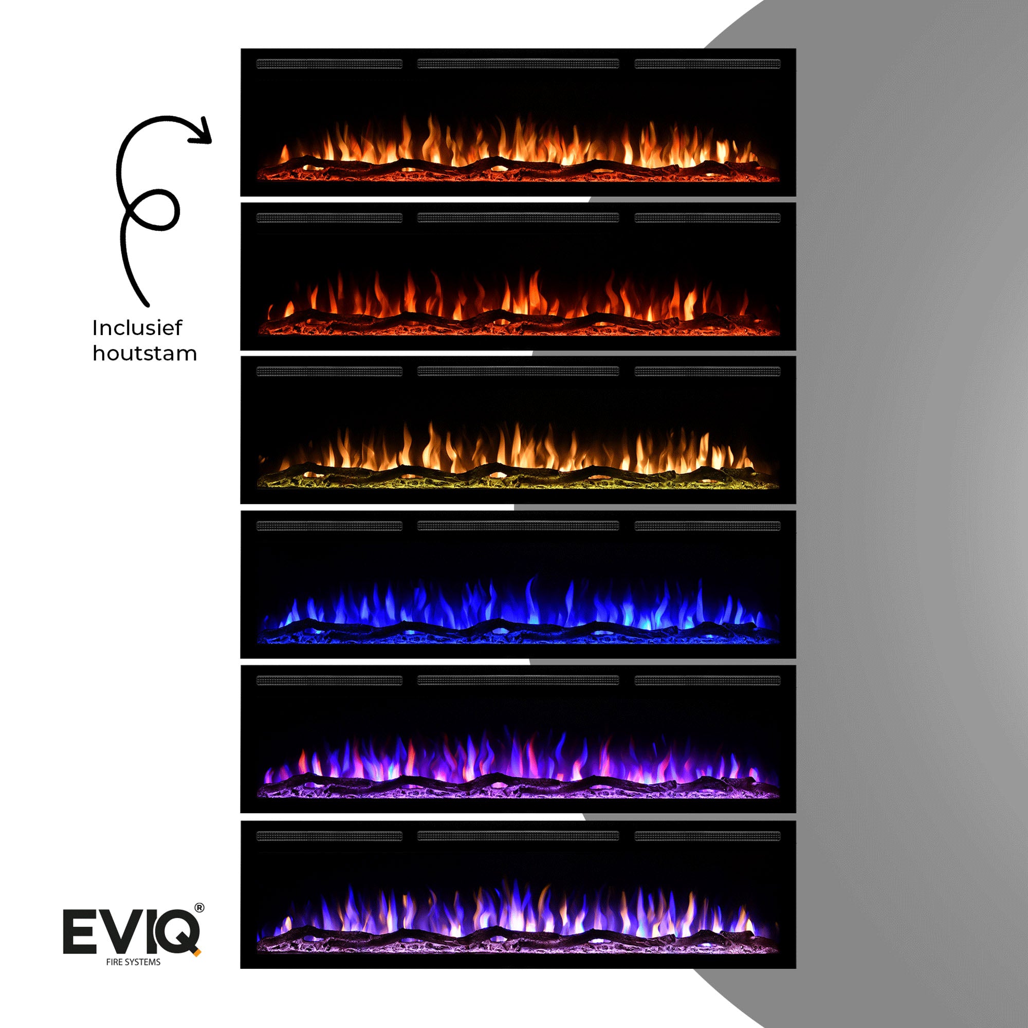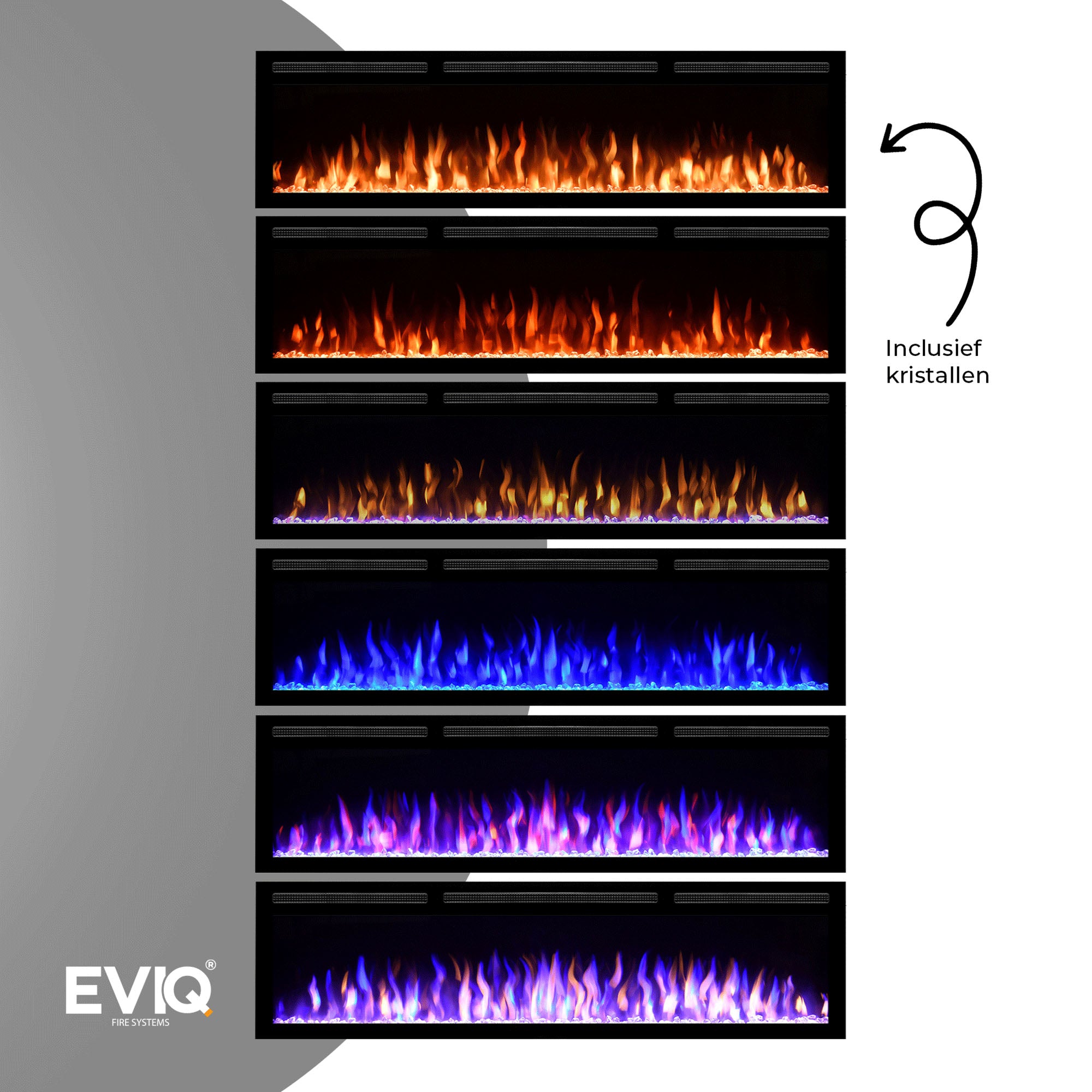 A: De EVIQ Diamond gebruikt realistische, energiezuinige Multi-Color LED-vlammen zonder echt vuur, en je kiest moeiteloos uit meerdere vlamkleuren voor de ideale ambiance.