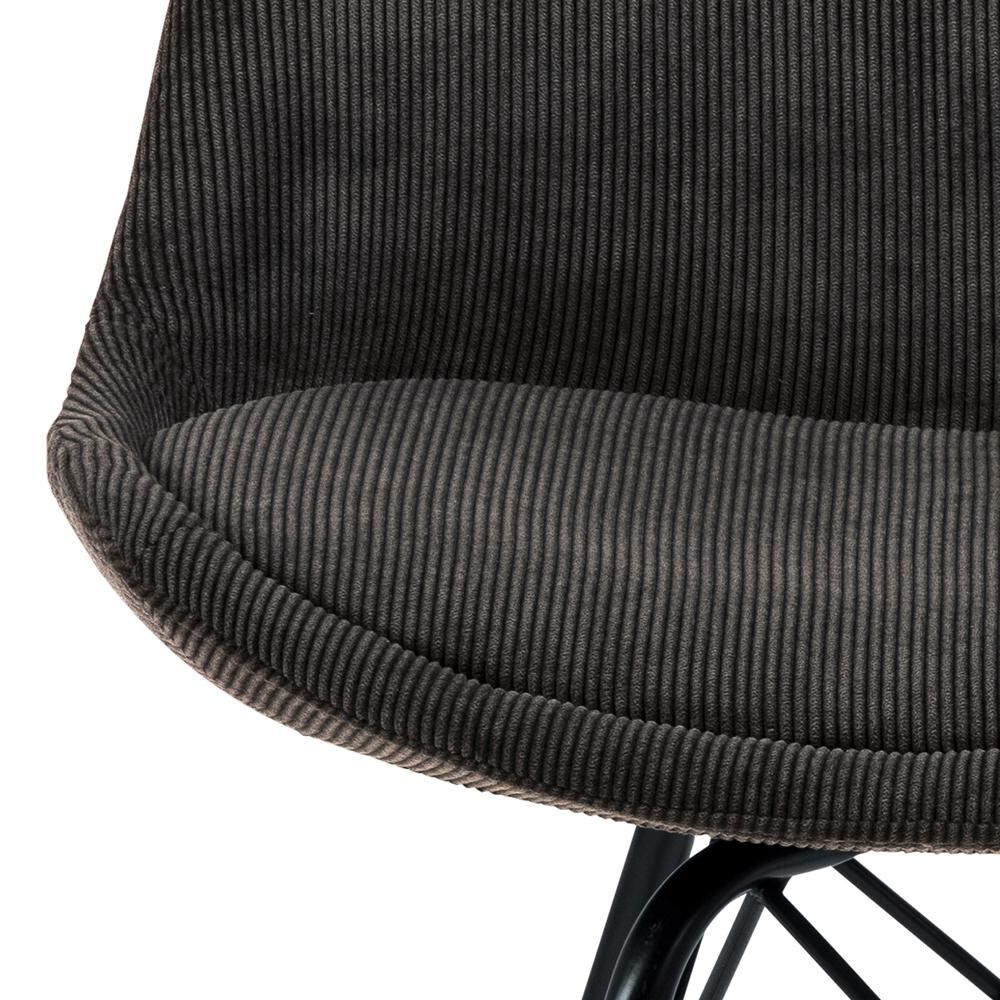 Eetkamerstoel met organisch gevormde zitting voor ergonomische steun en comfort. Gestoffeerd in antraciet winddoek (85% polyester/15% polyamide, >90.000 Martindale) voor slijtvaste, zachte zit. Mat zwarte, gepoedercoate stalen poten. Deels voorgemonteerd. Draagkracht 110 kg.