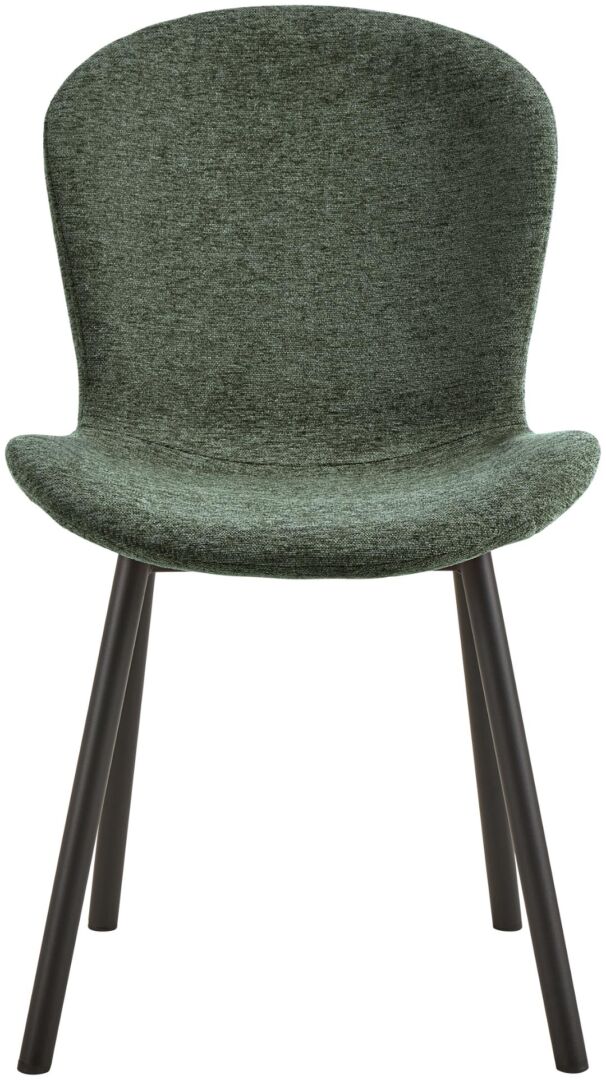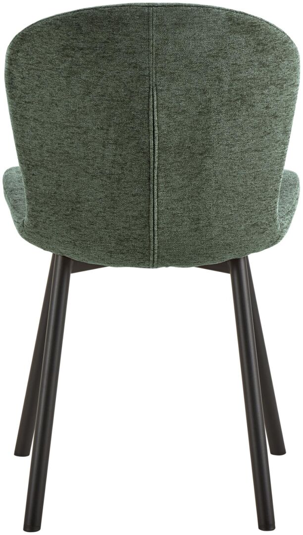 Comfort en stijl voor elke dag: deze eetkamerstoel in groen 100% polyester (Martindale >40.000) met PU-schuimzitting. Matzwarte stalen 4 poten, ruw gepoedercoat, met plastic pootdoppen. Zithoogte 47 cm, breedte 50 cm, diepte 42 cm. Draagkracht 110 kg. Gedeeltelijke montage.
