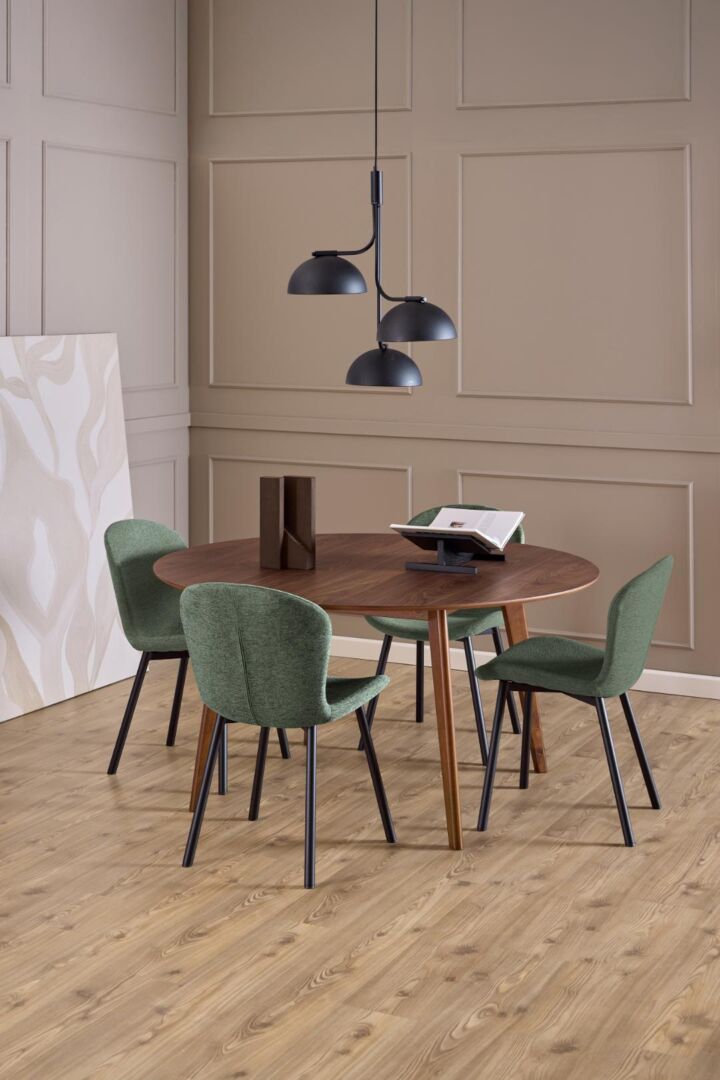 Het ondersteunende zitmeubel nodigt uit tot lange gesprekken en behoudt vorm en comfort bij dagelijks gebruik. De zachte stof voelt warm, terwijl het stalen onderstel elke beweging zeker opvangt. Past bij zowel moderne als klassieke tafelopstellingen.