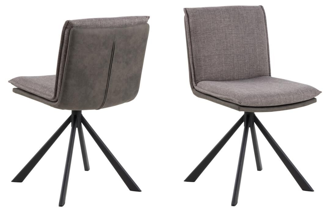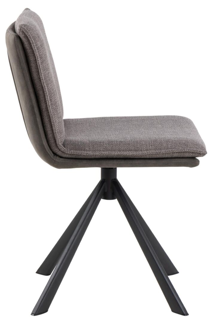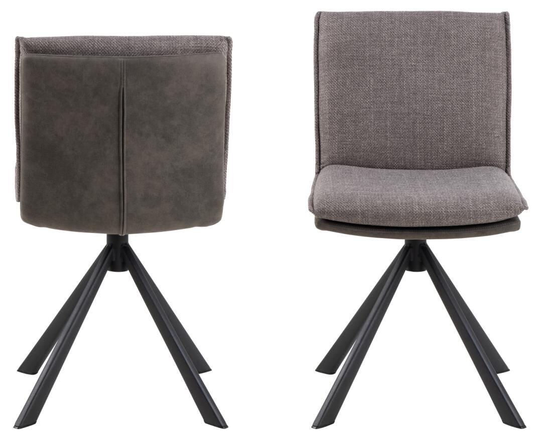 Eetkamerstoel met draaifunctie, tweekleurige stof (lichtgrijsbruin/anthraciet) met rits en comfortabele schuimvulling. Duurzame 100% polyester zitting (Martindale >50.000). Matzwart stalen 4-ster onderstel, ruw gepoedercoat, met kunststof pootdoppen. Gedeeltelijke montage. Draagkracht 110 kg.