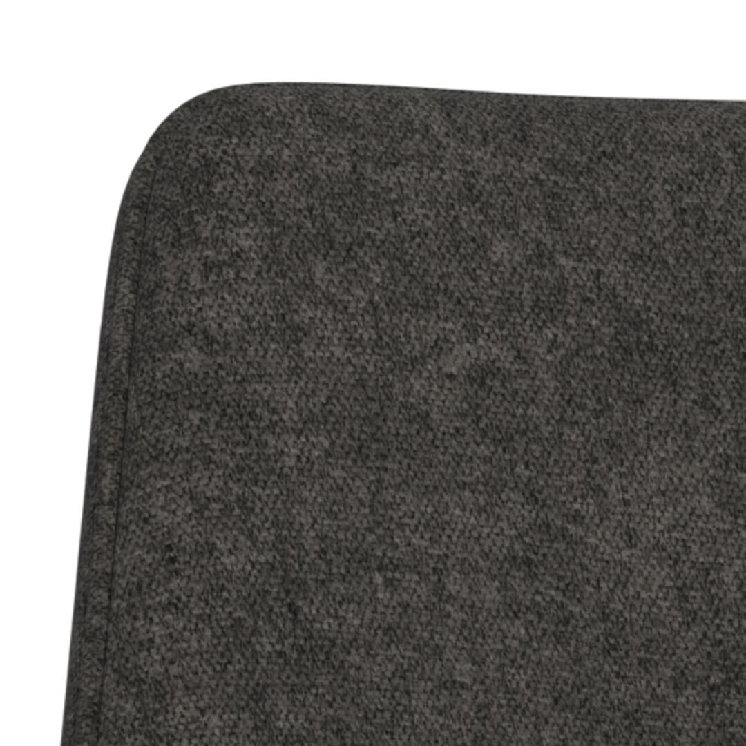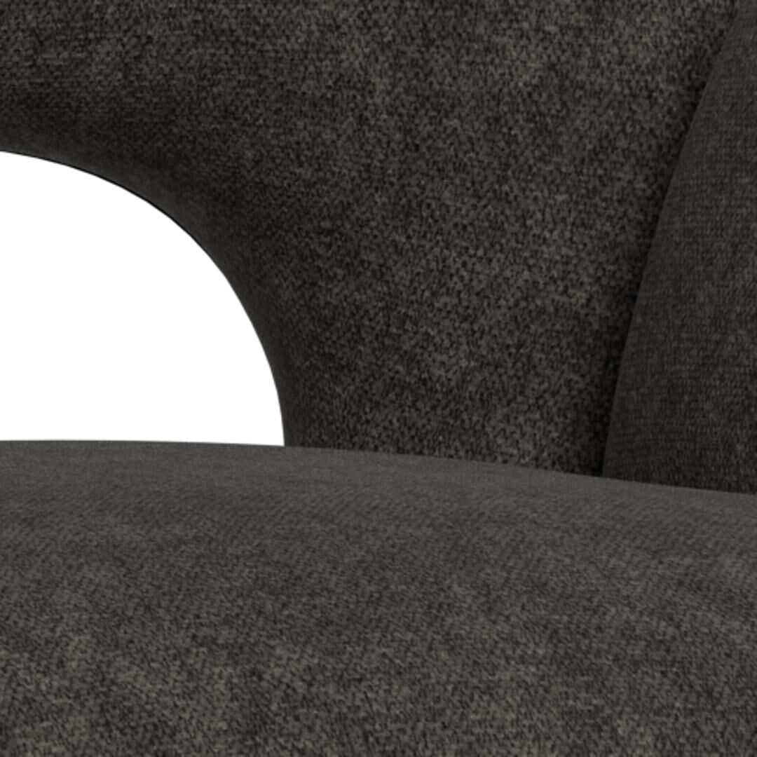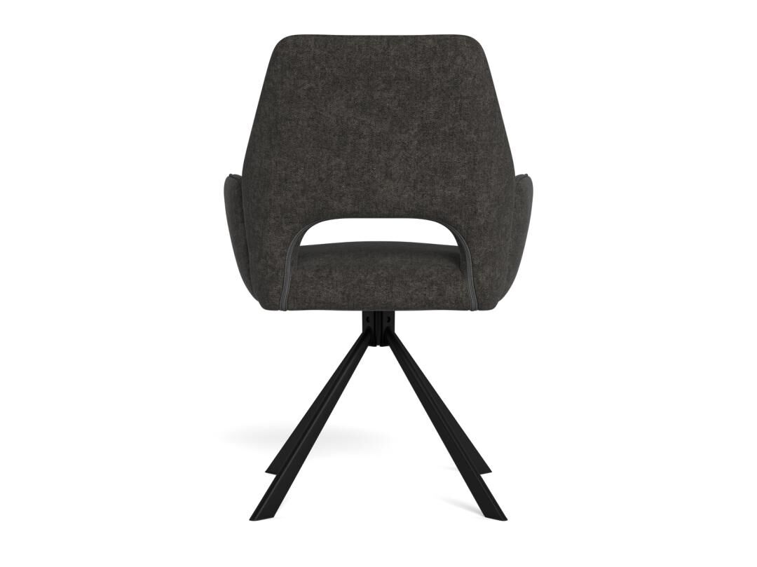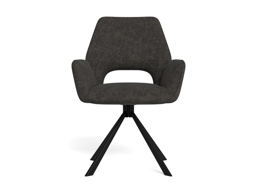 Steunende rondingen, een rustige draai, en een zitvlak dat je welkom heet. Een donkergrijze chenille-look ontmoet een slanke, matzwarte 4‑ster voet van gepoedercoat staal.