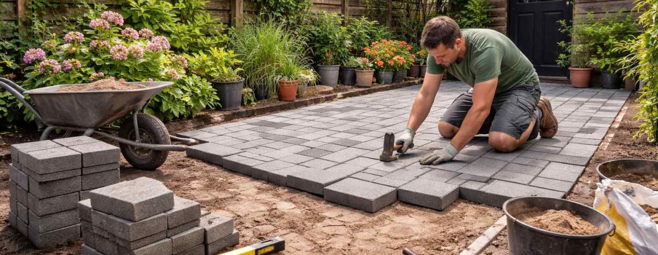 Goed gereedschap scheelt tijd en frustratie. Denk aan: schop en kruiwagen, waterpas, rei/lat, koord en piketten, trilplaat (huur), bezem, tegelsnijder of slijper, kniebeschermers en werkhandschoenen. Een rubberen hamer is bijna onmisbaar om alles netjes op hoogte te tikken zonder randen te beschadigen.