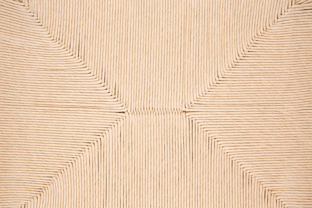 Afmetingen: totale hoogte 83 cm; zithoogte 46 cm; breedte 54 cm; diepte 54 cm; rughoogte 41 cm. Materiaal & onderhoud: geolied eiken en papierkoord; afnemen met zachte doek, vlekken voorzichtig droog deppen. Kleur: licht witgepigmenteerd eiken met gebroken wit koord. Combineert fraai met eiken tafels of een mix van zitoplossingen.