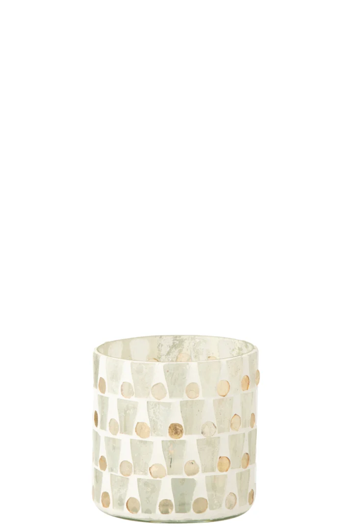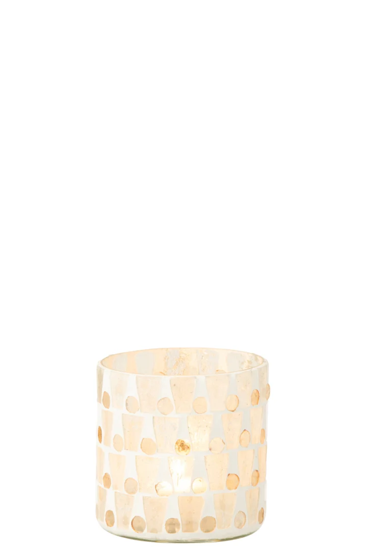 Deze kaarsenhouder zorgt bij het avondeten voor een zacht licht en warme sfeer. Het mozaïekglas weerkaatst subtiel de vlam, en de neutrale kleuren passen bij uiteenlopende interieurs. Minder geschikt voor felle verlichting. Ideaal voor sfeervolle decoratiezoekers. Aan te raden.