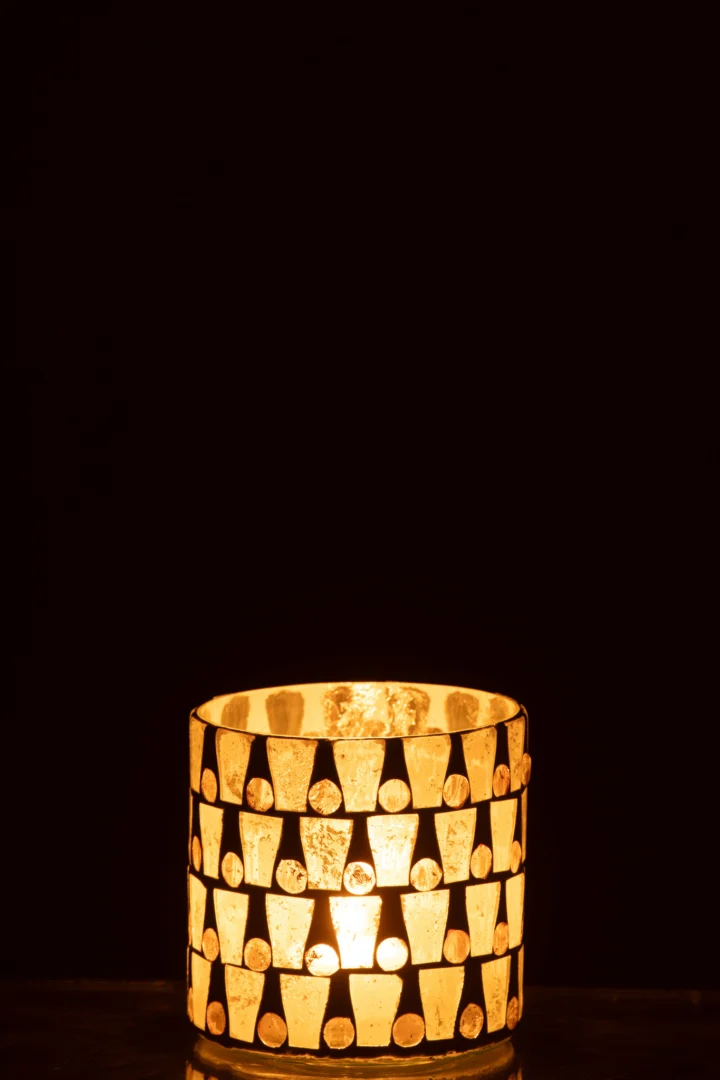 Deze kaarsenhouder geeft subtiel licht tijdens rustige avonden en voegt een decoratief accent toe door het mozaïekpatroon. Het glazen materiaal oogt stijlvol, maar is kwetsbaar bij verplaatsen. Geschikt voor wie sfeerverlichting zoekt met een verfijnde uitstraling. Prima keuze.