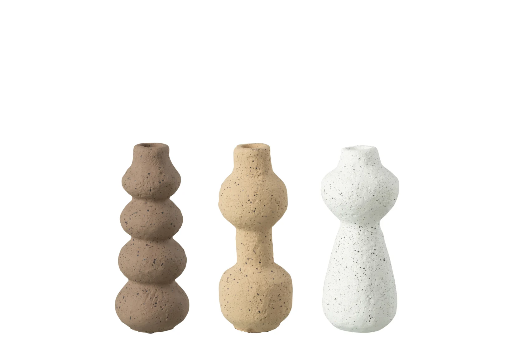 Ontdek drie sfeervolle kaarsenhouders van massief cement (100%) met keramische uitstraling, 8,5 bij 8,5 bij 20 centimeter, 1 kg; beige/wit mix. Robuust modern accent voor eettafel, dressoir of vensterbank. J-Line, Summer 2023. Levering 2-3 dagen.